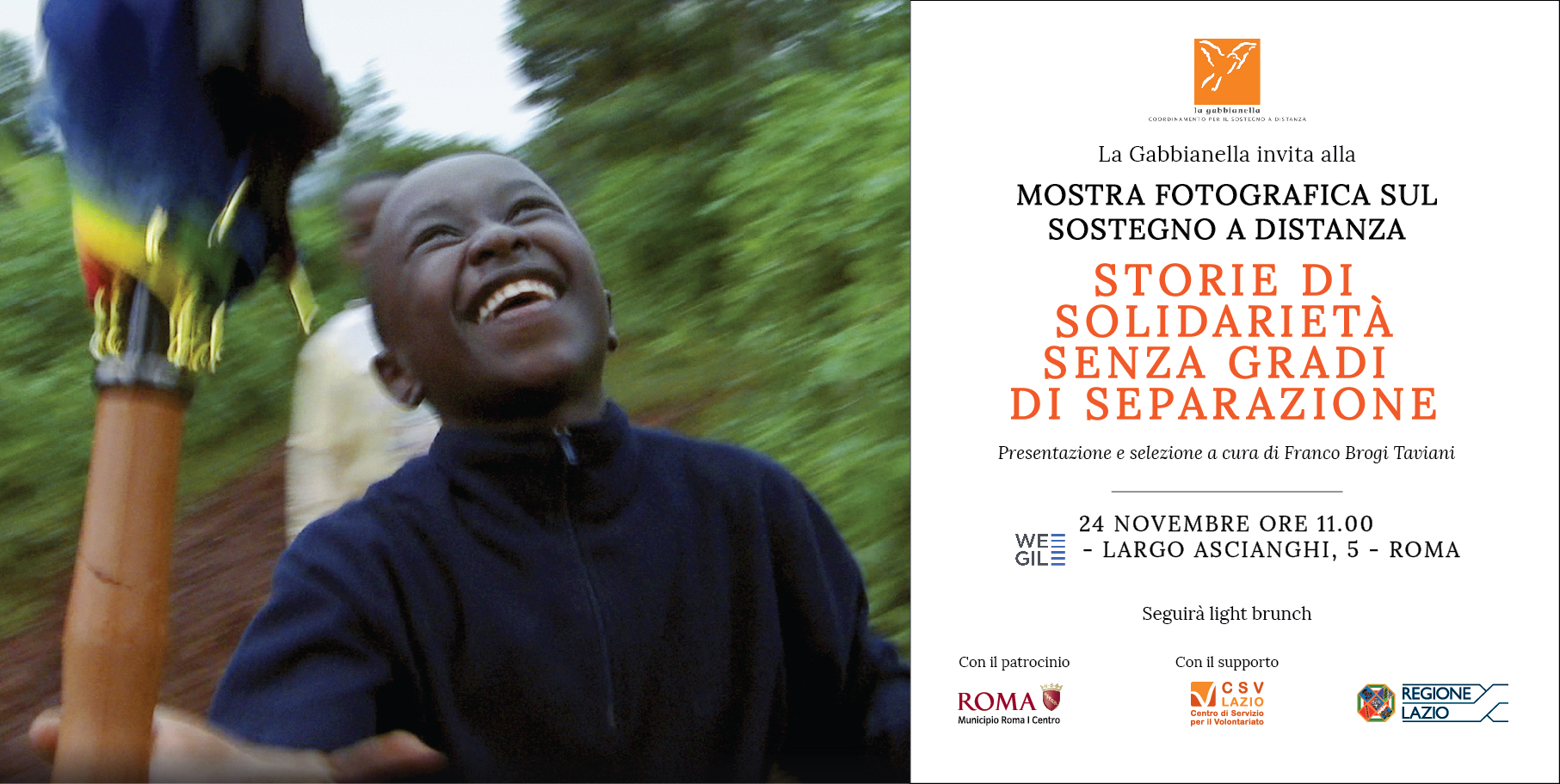 Il Coordinamento per il Sostegno a Distanza La Gabbianella organizza una mostra fotografica dal titolo “Storie di solidarietà senza gradi di separazione”. L’iniziativa si terrà il domenica 24 Novembre alle ore 11.00 alle ore 18.00 presso lo Spazio WeGil‚ in Largo Aschianghi 5‚ a Roma. “Storie di solidarietà senza gradi di separazione” si pone l’obiettivo di riproporre all’attenzione il tema del Sostegno a Distanza e della solidarietà internazionale. In particolare l’iniziativa vuole sgombrare il campo dagli stereotipi e riflettere "senza parole" sull'abuso di slogan. La selezione di opere che verranno esposte racconta i progetti portati avanti con impegno e costanza da alcune delle organizzazioni aderenti al Coordinamento. Sarà presentato un grande mosaico di umanità con immagini e testimonianze di sostenitori e beneficiari da tutti i paesi del mondo. Un grande progetto‚ che è stato possibile realizzare grazie all’impegno delle associazioni aderenti al Coordinamento‚ ai fotografi‚ alle persone che hanno messo a disposizione la loro professionalità‚ tra cui Franco Brogi Taviani‚ regista‚ sceneggiatore e scrittore‚ che ha selezionato le foto e che presenterà la Mostra.
