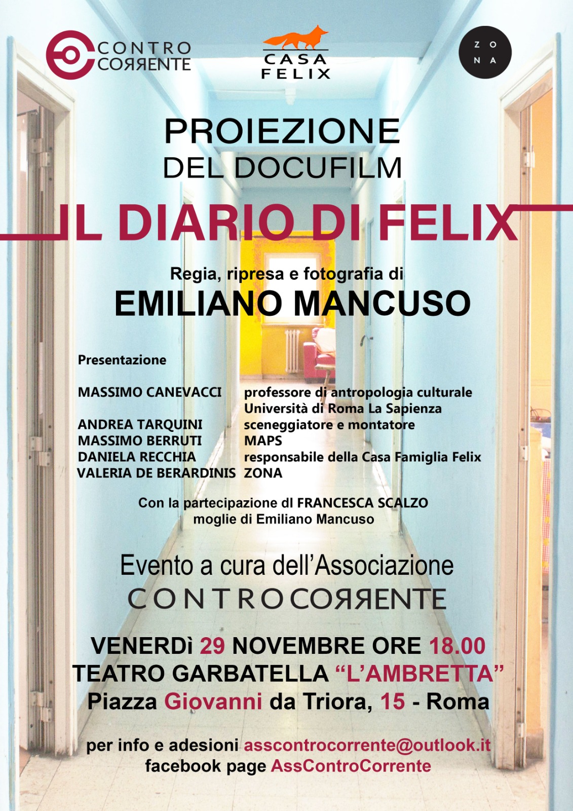 L'Associazione ControCorrente presenta la proiezione del docufilm "Il Diario di Felix" di Emiliano Mancuso‚ che si terrà venerdì 29 novembre ore 18.00 al Teatro della Garbatella L'Ambretta (Roma) in Piazza Giovanni da Triora‚ 15. Felix è il nome di una casa famiglia nella periferia romana. Il Diario di Felix è un documentario che racconta un anno in questa casa famiglia e in particolare l’incontro fra tre ragazzi Giuseppe‚ Emad e Valerio‚ ognuno con una difficile storia alle spalle. Il regista Emiliano Mancuso‚ prematuramente scomparso‚ vive un anno intero insieme a loro fino a scomparire lasciandoci solo il suo sguardo. Questo delicato documentario‚ prodotto da Zona‚ è stato selezionato al Festival dei Popoli 2014 e finalista al Globo d’oro 2015.