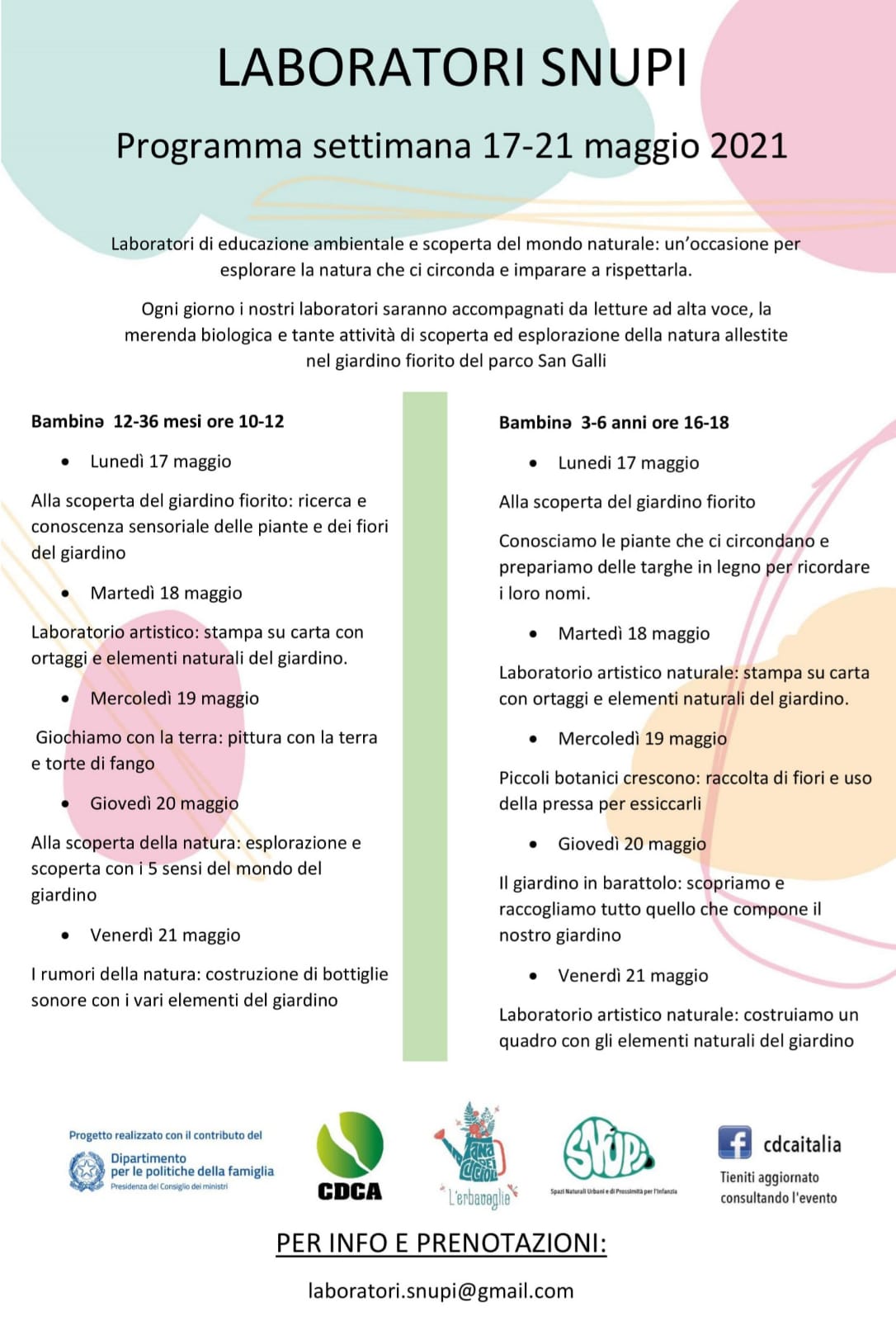 A partire dal 17 maggio si terranno i laboratori gratuiti per bambine/i dell'associazione SNUPI. Si tratta di un progetto per avvicinare i bambini/e all'educazione ambientale e alla scoperta del mondo naturale. Un'occasione per le famiglie per accedere a percorsi educativi gratuiti e qualificati. I laboratori si terranno presso l'Area fiorita del Parco Sangalli in Viale dell'Acquedotto Alessandrino da maggio a ottobre 2021. Bambini/e 12 - 36 mesi da Lunedì al Venerdì dalle ore 10.00 alle 12.00 E' compresa la merenda merenda biologica.