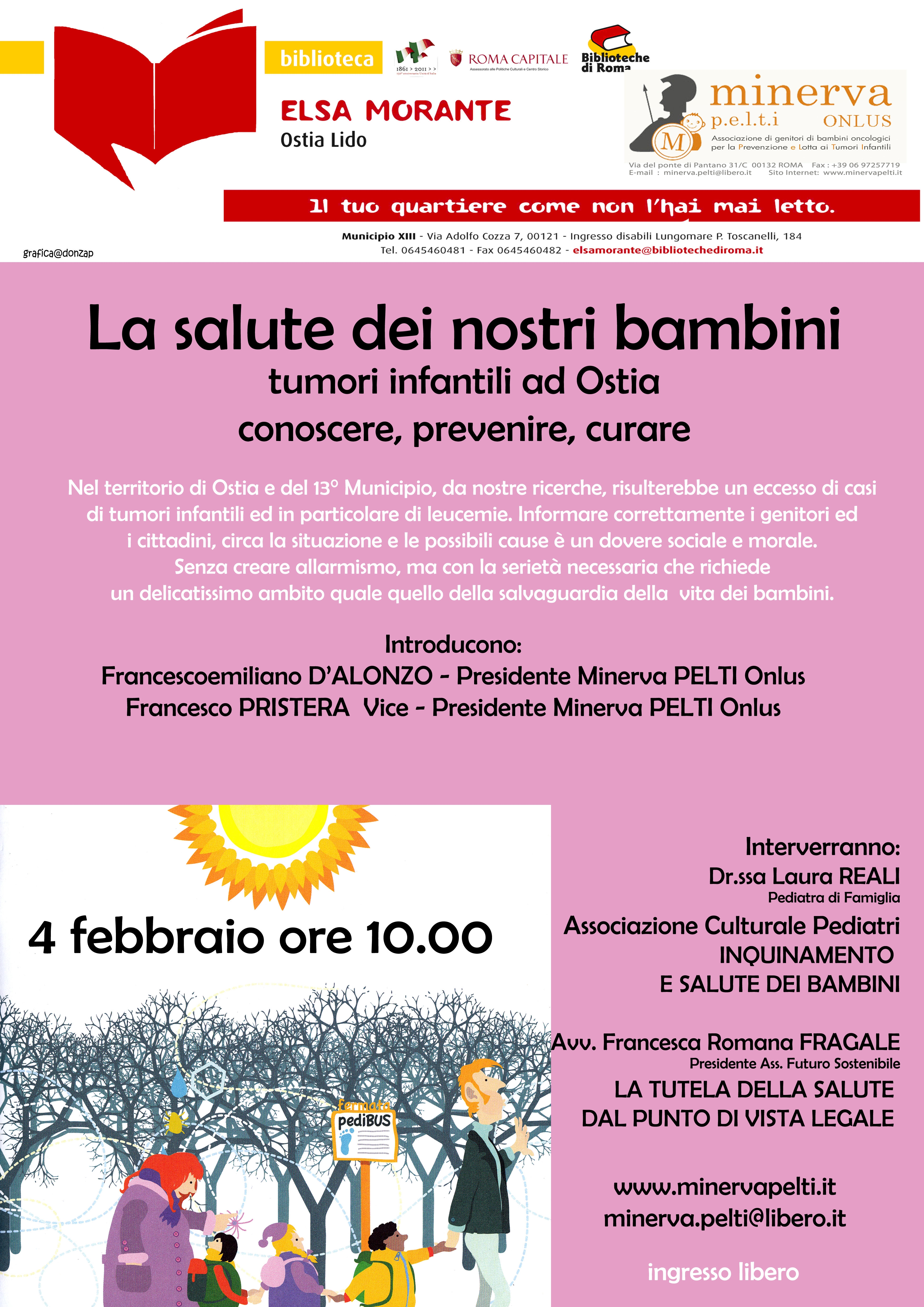 L’associazione Minerva P.e.l.t.i. Onlus di genitori di bambini oncologici per la Prevenzione e Lotta ai Tumori Infantili presenta l’incontro intitolato La salute dei nostri bambini. Tumori infantili ad Ostia: conoscere‚ prevenire‚ curare. L’appuntamento è per sabato 4 febbraio 2012 alle 10.00 presso la biblioteca Elsa Morante di Ostia Lido in via Adolfo Cozza 7‚ a Roma.