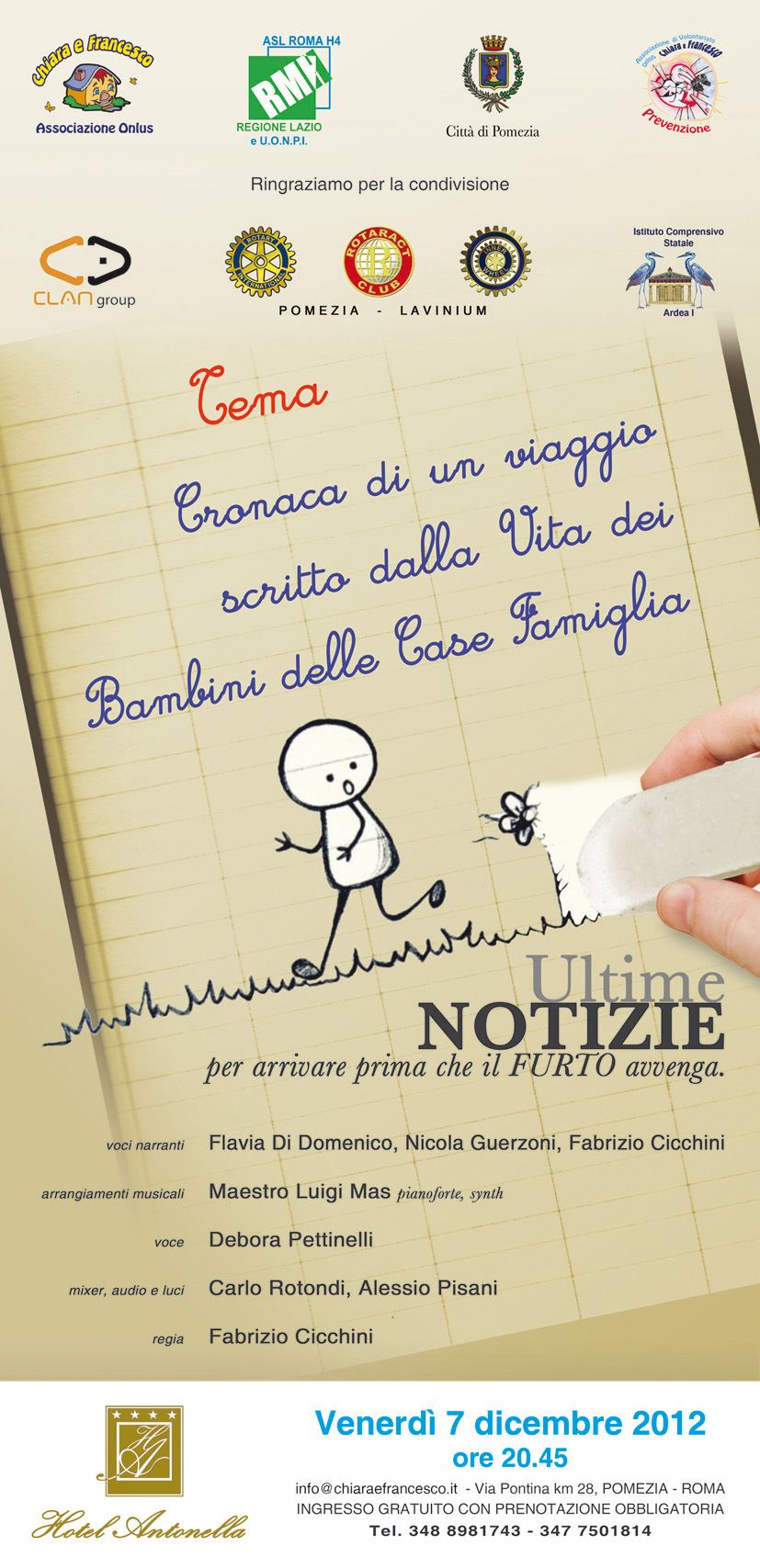 Infanzia AdolescenzaTrova in questo notiziarioCerca la notizia a partire da una parola chiave contenuta nel titolo o nel sottotitolo oppure in base al periodo di pubblicazione. Tema: cronaca di un viaggio scritto dalla Vita dei Bambini delle Case FamigliaSpettacolo multimediale promosso dall’associazione Chiara e Francesco 29/11/2012