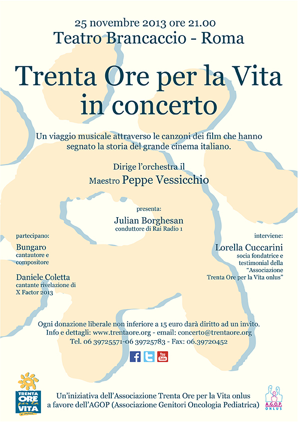 L’appuntamento è lunedì 25 novembre 2013 con Trenta Ore per la Vita in concerto che si svolgerà presso il teatro Brancaccio di Roma‚ alle ore 21.00.