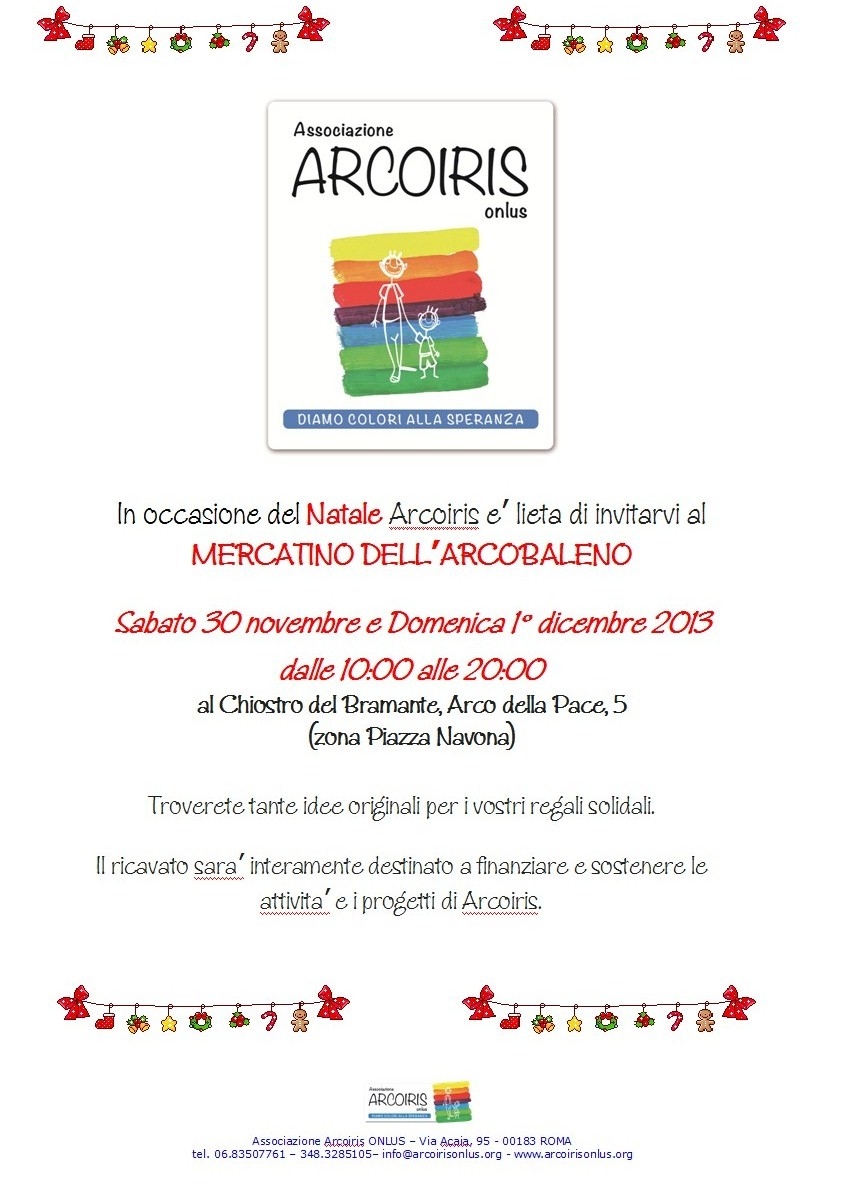 In occasione delle Feste natalizie‚ sabato 30 novembre e domenica 1° dicembre 2013 Arcoiris Onlus organizza a Roma‚ nella suggestiva cornice del Chiostro del Bramante‚ il Mercatino dell’Arcobaleno.