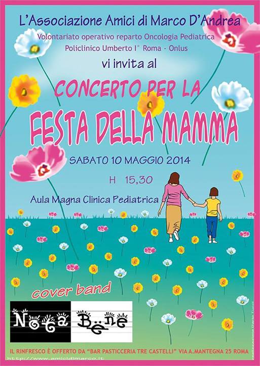Sabato 10 maggio 2014‚ l’associazione Amici di Marco D’Andrea invita al Concerto per la Festa della Mamma che si terrà alle ore 15:30 presso l’Aula Magna della Clinica Pediatrica del Policlinico Umberto I di Roma.