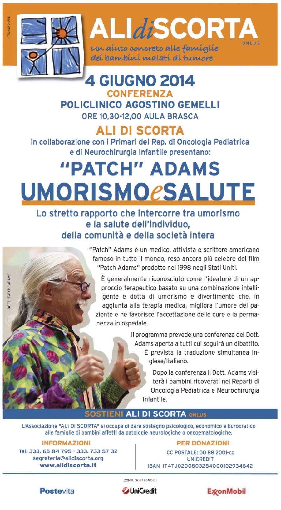 L’associazione Ali di scorta organizza una conferenza del dott. Patch Adams dal titolo Umorismo e Salute – Lo stretto rapporto che intercorre tra umorismo e salute dell’individuo‚ della comunità e della società intera.