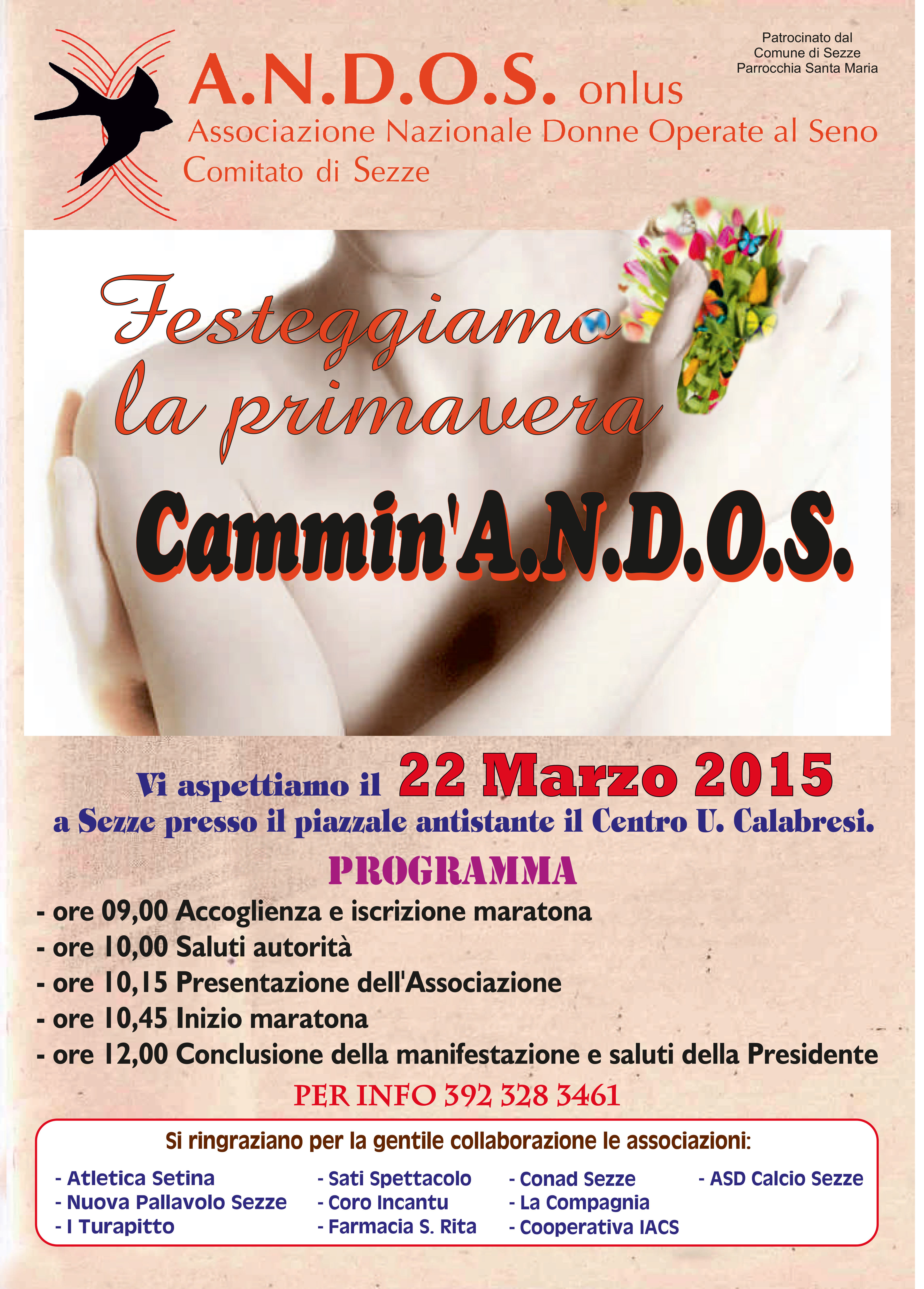 L’Associazione Nazionale Donne Operate al Seno Onlus Comitato di Sezze organizza una maratona per domenica 22 marzo al fine di sensibilizzare l’opinione pubblica sulle problematiche che ogni donna che ha subìto un intervento al seno possa incontrare. Appuntamento alle ore 9.00 presso il piazzale antistante il Centro Sociale Mons. Ubaldo Calabresi a Sezze (Latina).