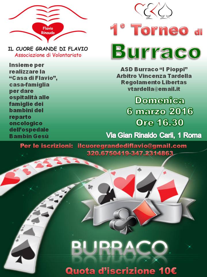 Un Torneo di Burraco per raccogliere fondi al fine di realizzare la Casa di Flavio‚ una casa famiglia che ospiti le famiglie dei bambini ricoverati presso il reparto oncologico dell'Ospedale Bambin Gesù di Roma. Un importante obiettivo dell'associazione Il cuore grande di Flavio che con forza sostiene come si possa aiutare gli altri anche giocando. Il Torneo si terrà domenica 6 marzo alle 16.30 in Via Gian Rinaldo Carli‚ 1 a Roma. La quota di iscrizione sarà di 10 euro. Per prenotazioni e informazioni è possibile contattare l'associazione scrivendo a: ilcuoregrandediflavio@gmail.com o chiamando il cell. 320.6750429 oppure 347.2314863.
