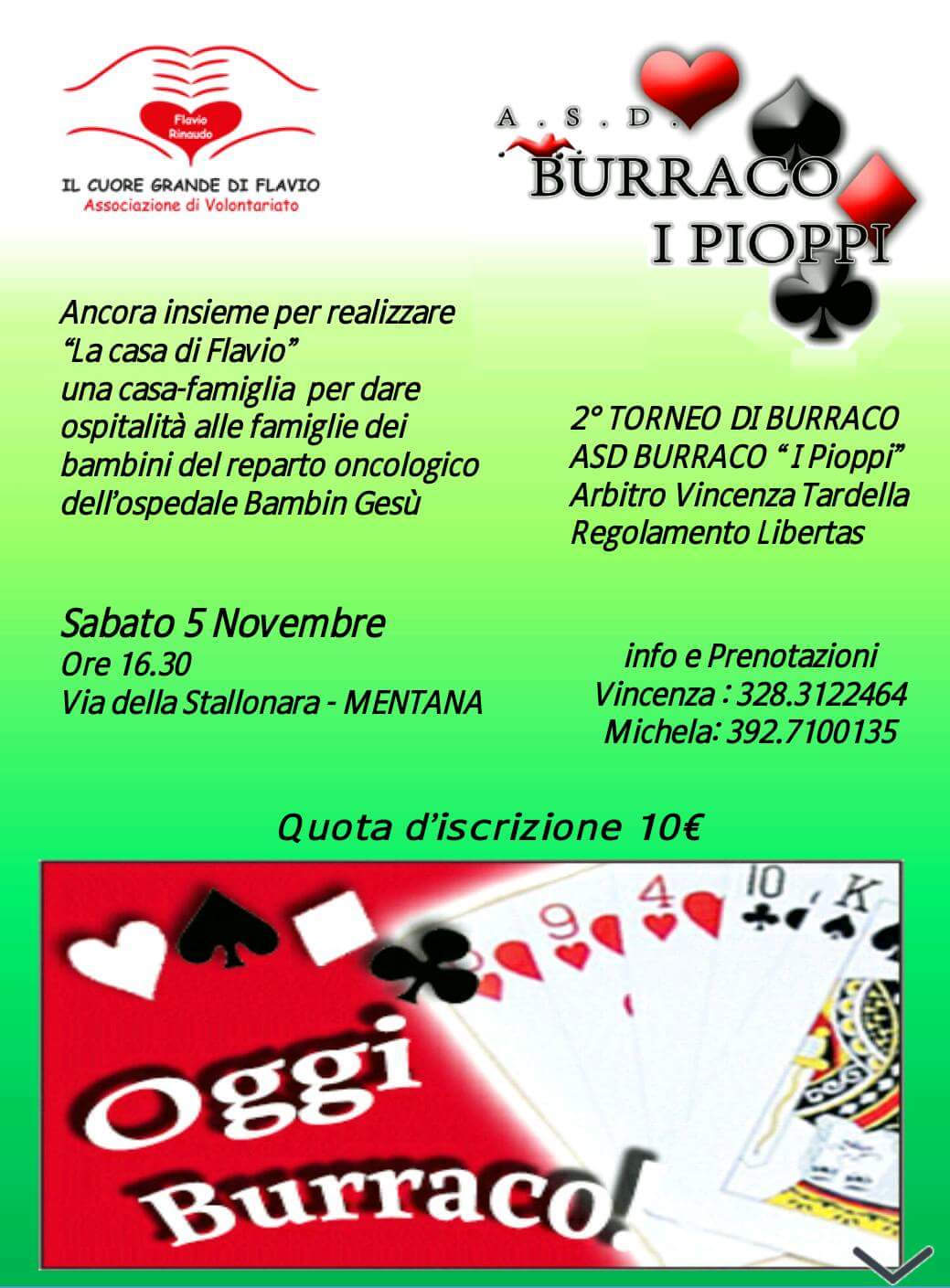 L’associazione il Cuore Grande di Flavio invita al 2° Torneo di Burraco organizzato per sabato 5 novembre alle ore 16.30‚ in via della Stallonara‚ a Mentana (Rm). L’organizzazione è a cura dell’A.S.D. Burraco i “Pioppi” e l’arbitraggio a cura di Vincenza Tardella. La quota di iscrizione è di 10 euro‚ i fondi raccolti saranno destinati alla realizzazione del progetto “La casa di Flavio”‚ una casa famiglia per dare ospitalità alle famiglie dei bambini del reparto oncologico dell’Ospedale Bambin Gesù. Per maggiori informazioni e prenotazioni contattare i numeri: 3283122464 e 3927100135
