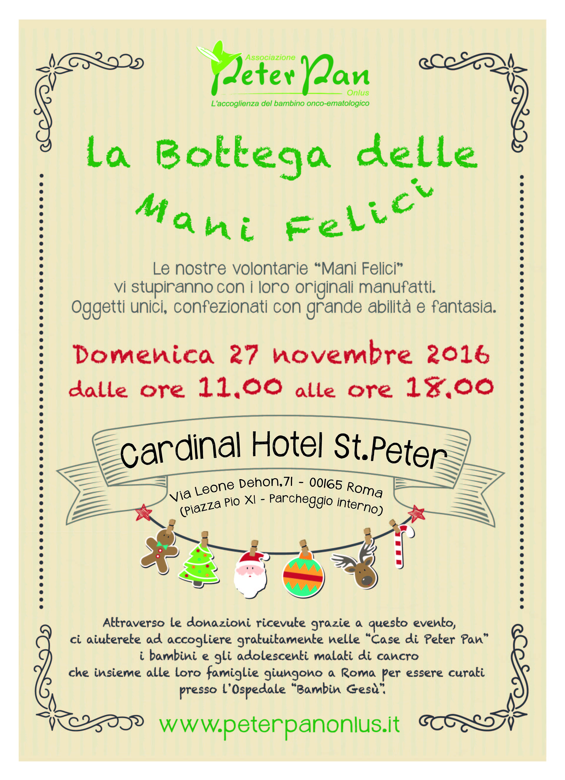 L’associazione Peter Pan organizza il mercatino La Bottega delle Mani Felici il giorno domenica 27 novembre dalle ore 10.00 alle ore 18.00 al Cardinal Hotel St. Peter in Via Leone Dehon‚ 71 a Roma. Un posto ideale dove poter acquistare‚ in vista del Natale‚ tanti bei manufatti originali realizzati dalle volontarie‚ dell’associazione Peter Pan‚ Mani Felici. Oggetti d’arredo‚ bigiotteria‚ pupazzi di stoffa‚ borse e tanto altro. Oltre all’originalità di pezzi unici‚ le “sorprese” da donare‚ contengono un valore aggiunto inestimabile: quello della solidarietà. Tutto ciò che verrà raccolto servirà a sostenere la “Grande Casa di Peter Pan” che da sempre si occupa di aiutare e accogliere gratuitamente i bambini e gli adolescenti malati di cancro che insieme alle loro famiglie giungono a Roma per essere curati presso l’ospedale Bambin Gesù. Per maggiori informazioni scrivere a: info@peterpanonlus.it o visitare il sito: www.peterpanonlus.it