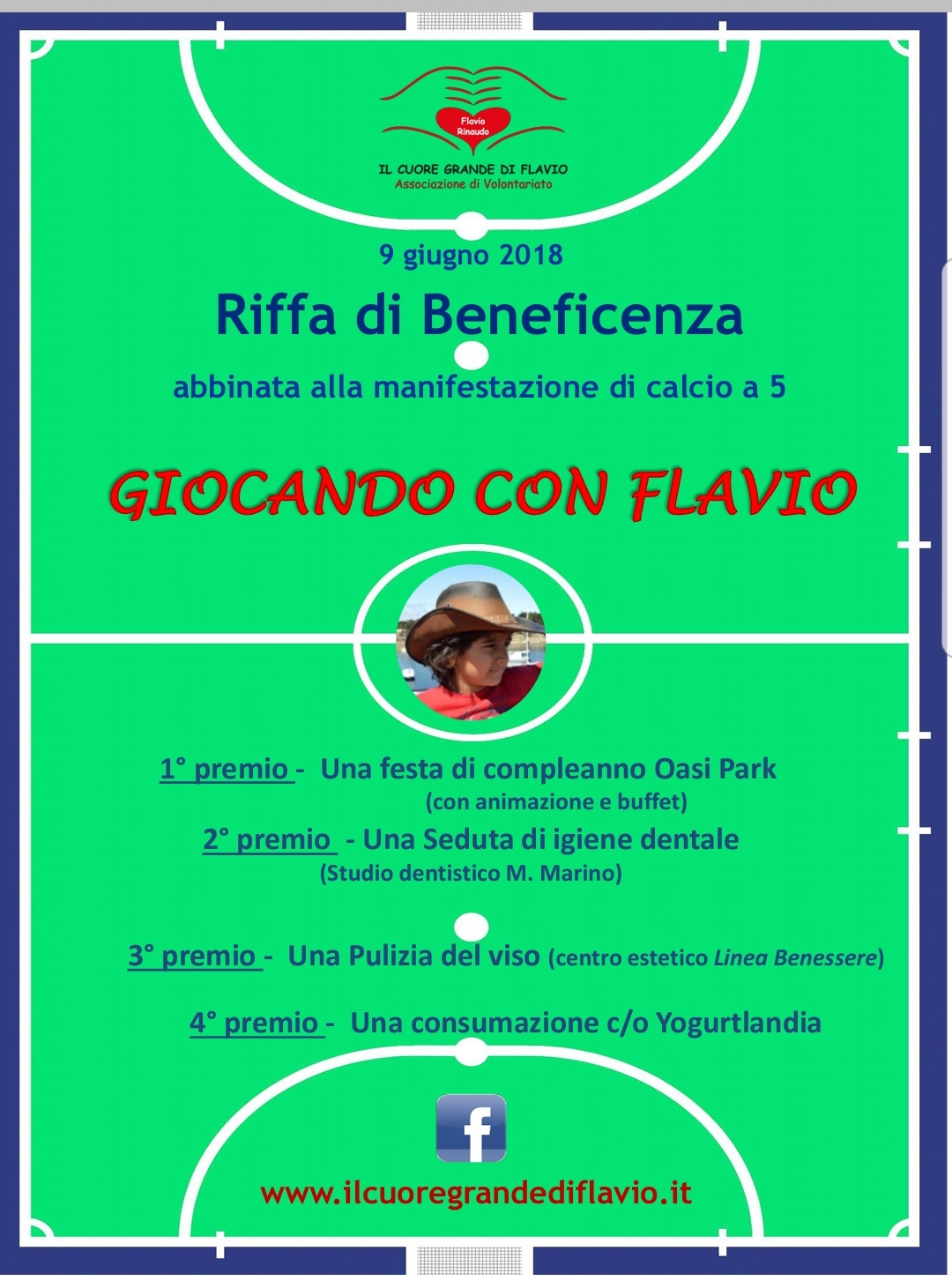 Si terrà sabato 9 giugno dalle 9.00 alle 12.00 il quadrangolare di calcio a 5 Giocando con Flavio organizzato dall’associazione Il cuore grande di Flavio. Il torneo si svolgerà in Viale Alessandrino‚ 144 a Roma. Al torneo a cui sarà abbinata una riffa di beneficenza. I fondi raccolti saranno destinati ad aiutare i bambini/ragazzi del reparto di oncologia pediatrica dell'Ospedale Bambin Gesù. Per l'acquisto dei biglietti è possibile chiamare (dopo le 15) o mandare un sms al 3206750419 o scrivere a ilcuoregrandediflavio@gmail.com