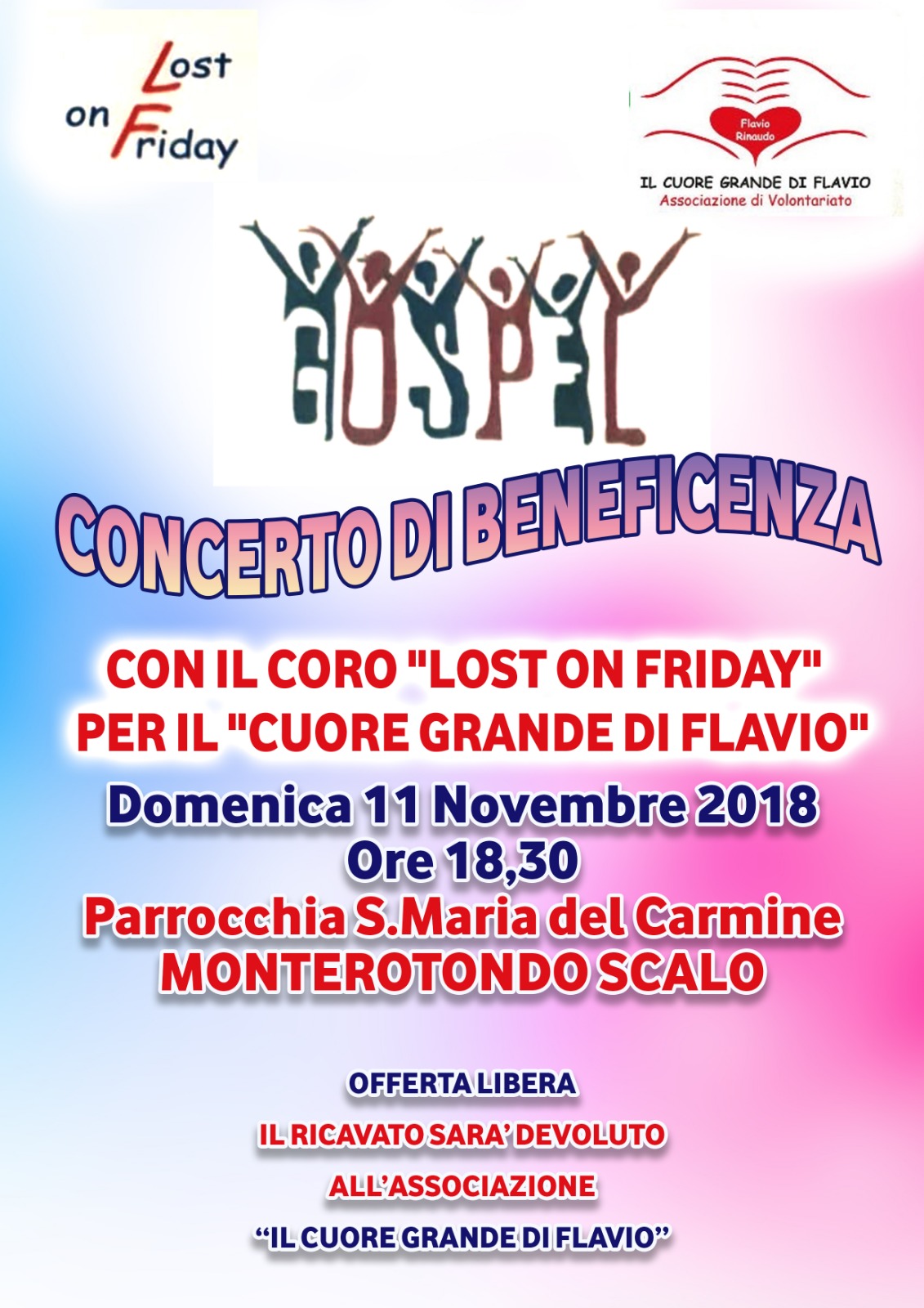L'associazione Il Cuore Grande di Flavio insieme al coro Lost on Friday‚ organizza Gospel‚ un concerto di beneficenza che si terrà l’11 novembre 2018 alle ore 18.30 presso la parrocchia di S. Maria del Carmine (Monterotondo Scalo). L’offerta è libera ed il ricavato sarà devoluto all’Associazione.