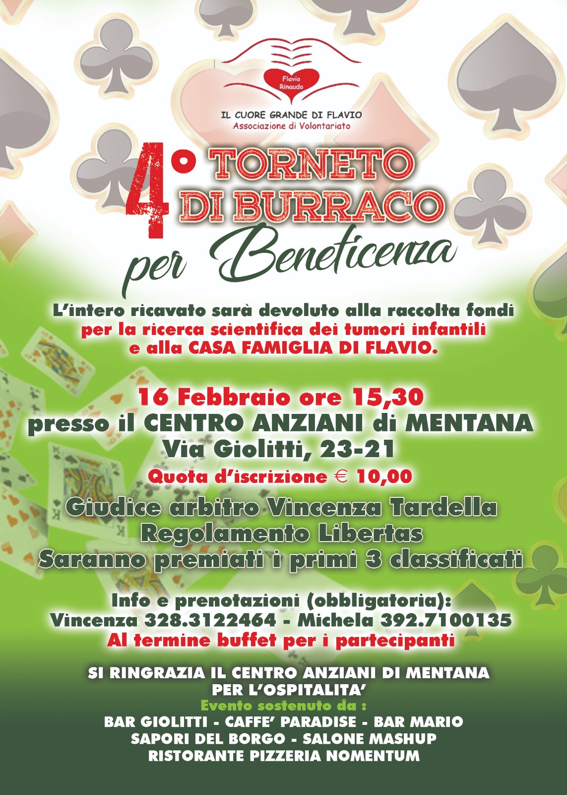 Sabato 16 febbraio dalle 15.30 si terrà un Torneo di burraco per beneficenza il cui ricavato sarà devoluto alla raccolta fondi per la ricerca scientifica dei tumori infantili e alla Casa Famiglia di Flavio dell'associazione Il Cuore Grande di Flavio. Il torneo si terrà presso il Centro Sociale Anziani di Mentana (RM) in Via Giolitti‚ 23. Per informazioni e prenotazioni è possibile contattare Vincenza 328.3122464 e Michela 392.7100135. Al termine del torneo è previsto un buffet per tutti i partecipanti.