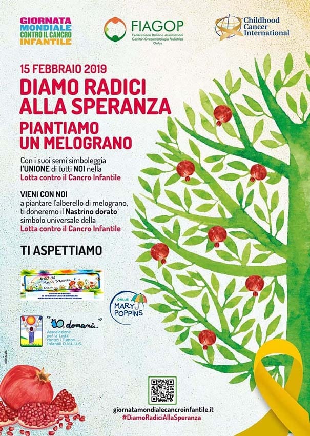 Venerdì 15 febbraio in occasione della Giornata Mondiale Contro il Cancro Infantile le associazioni Io domani onlus‚ Mary Poppins onlus e Amici di Marco D'Andrea onlus parteciperanno all’iniziativa di sensibilizzazione pubblica Diamo Radici Alla Speranza - Piantiamo un Melograno e invitano alla messa a dimora dei melograni nello spazio antistante la Clinica Pediatrica del Policlinico Umberto I di Roma. Parteciperanno i bambini della UOC di Oncoematologia Pediatrica del Policlinico Umberto I insieme ai loro familiari‚ ai medici e allo staff infermieristico. Il melograno con i suoi semi simboleggia l'unione di tutti nella Lotta contro il Cancro Infantile. Tutti coloro che parteciperanno alla piantagione degli alberelli avranno in dono un natrino dorato che è il simobolo universale della Lotta contro il Cancro Infantile. Visita il sito della giornata mondiale contro il cancro infantile