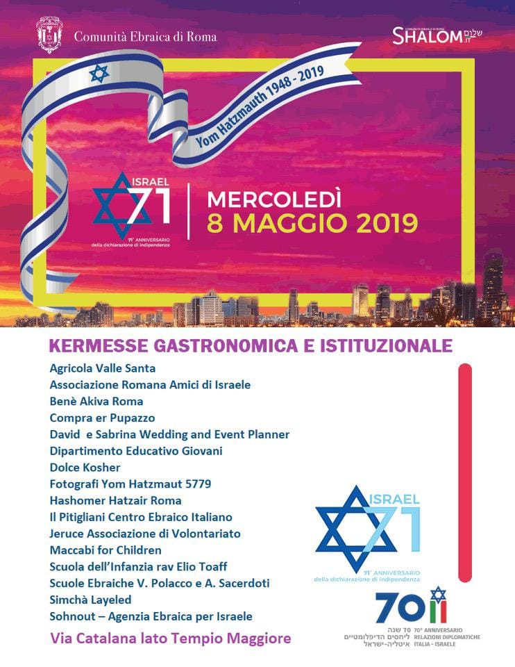 L'associazione Jeruce parteciperà‚ mercoledì 8 maggio 2019‚ ai festeggiamenti per il 71esimo anniversario della dichiarazione d'indipendenza di Israele. Presso il Ghetto di Roma sono previsti momenti di festa e una kermesse gastronomica e istituzionale.