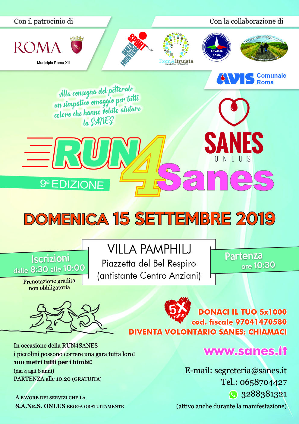 Si terrà domenica 15 settembre la 9a edizione della Run4SANES organizzata dall'associazione Sanes onlus. La corsa si svolgerà a Villa Pamphili con partenza dalla Piazzetta del Bel Respiro. Le iscrizioni si aprono alle 8.30 ma è gradita la prenotazione via mail segreteria@sanes.it o via whatsapp al cell. 328.8381321 per agevolare l’organizzazione del ristoro e del pacco gara. L'inizio della gara è previsto per le 10.30. Il costo per partecipare è di 5 euro per i 5 km (che si possono fare correndo‚ camminando‚ pedalando o come si preferisce). Possonon partecipare anche i cani che accompagnano i padroni. I bambini dai 4 agli 8 anni possono correre i 100 metri in maniera del tutto gratuita e divertirsi. I proventi della corsa verranno utilizzati per mantenere gratuiti i servizi che l'associazione offre ai pazienti onco-ematologici dell’Ospedale San Camillo di Roma.