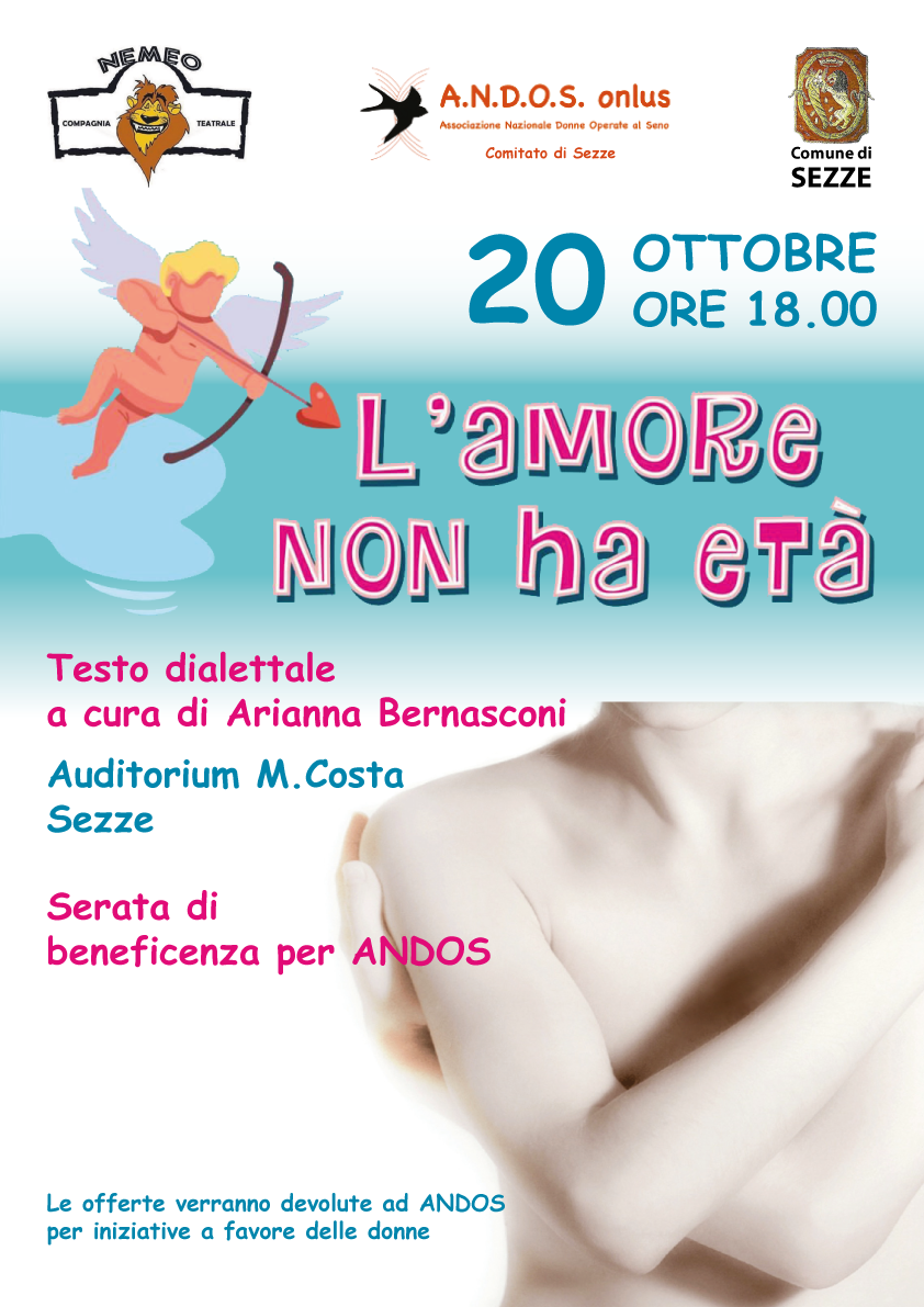Si terrà domenica 20 ottobre alle ore 18.00 lo spettacolo teatrale L'amore non ha età che si svolgerà presso l'Auditorium M. Costa a Sezze (LT). Testo dialettale a cura di Arianna Bernasconi realizzato dalla compagnia teatrale Nemeo. Il ricavato sarà donato in beneficenza per ANDOS Sezze (LT).