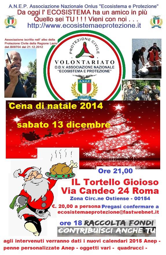 L’ANEP (Associazione Nazionale Onlus Ecosistema e Protezione) invita alla Cena di Natale 2014 organizzata in sostegno alle attività associative. L’appuntamento è sabato 13 dicembre 2014 alle ore 21 presso Il Tortello Gioioso in Via Candeo 24 a Roma.
