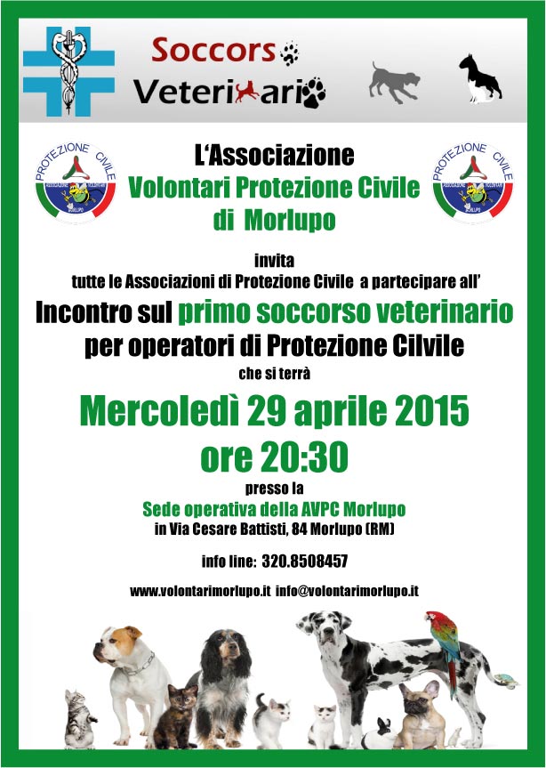 Mercoledì 29 aprile alle ore 20.30‚ l’Associazione Volontari protezione Civile Morlupo organizza un incontro sul Primo soccorso veterinario‚ dedicato agli operatori di Protezione Civile.