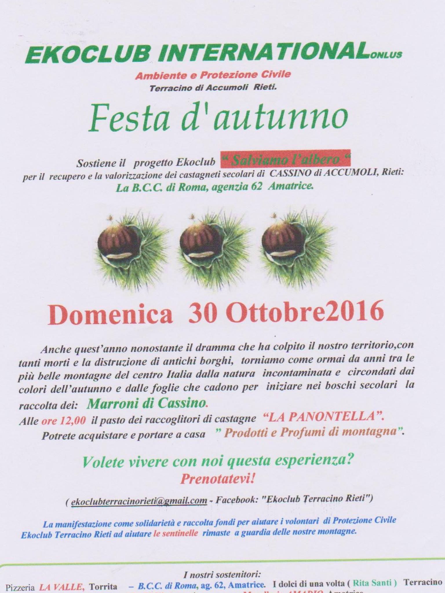 L’associazione Ekoclub sezione di Terracino Accumoli di Rieti‚ invita alla tradizionale Festa d’Autunno organizzata per domenica 30 ottobre a Cassino (RI). La festa inizierà nei boschi secolari con la tipica raccolta dei marroni di Cassino alle ore 12.00 il pasto dei raccoglitori di castagne “La Panontella”. Sarà possibile acquistare e portare a casa prodotti tipici della montagna. Tutto il ricavato della manifestazione verrà utilizzato per iniziative di solidarietà nel territorio e per sostenere i volontari di Protezione civile Ekoclub affinché possano continuare ad aiutare le "sentinelle" rimaste a guardia delle montagne. Per prenotazioni e informazioni scrivere a: ekoclubterracinorieti@gmail.com