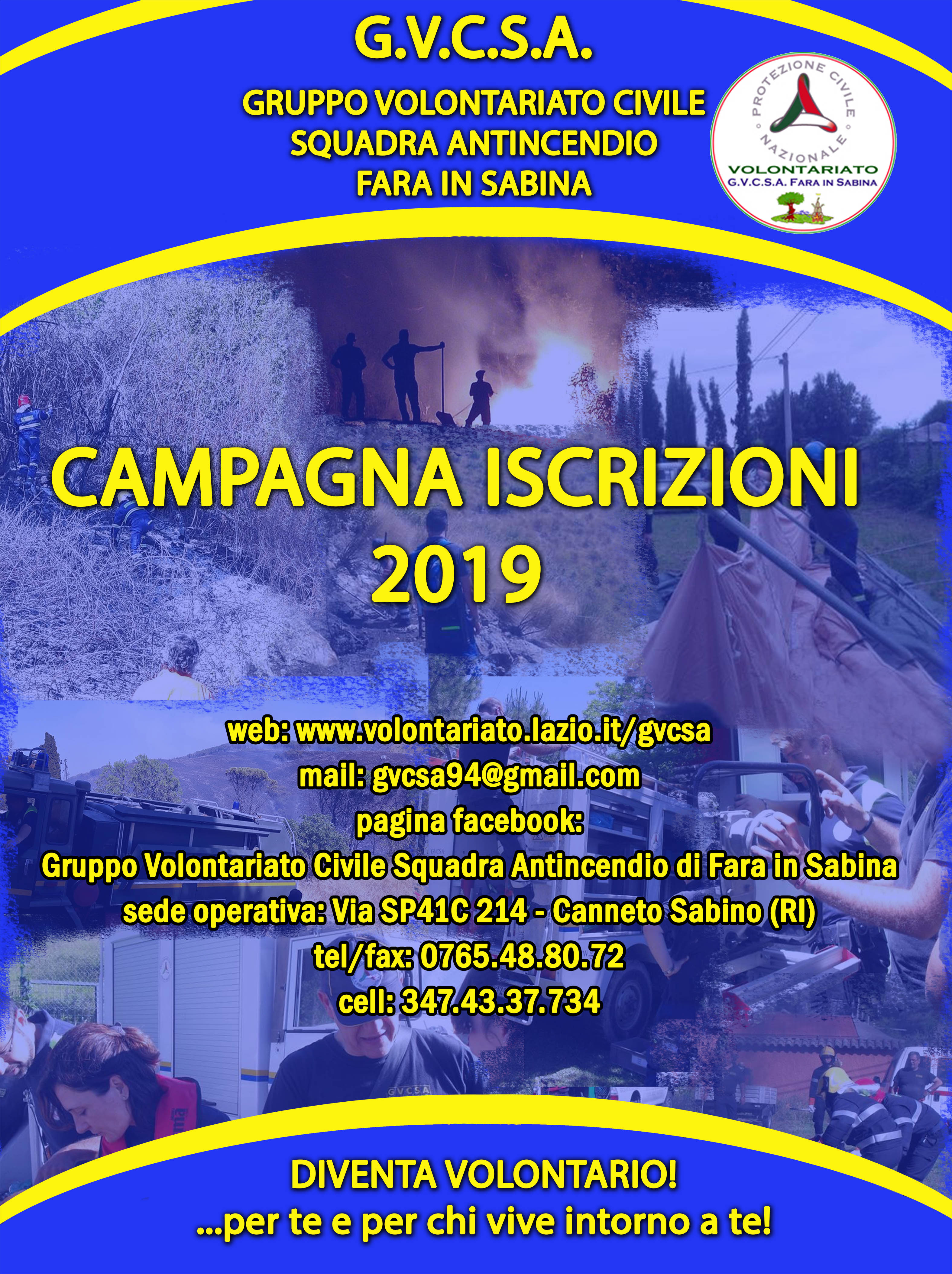 Il Gruppo Volontario Civile Squadra Antincendio Fara in Sabina apre la Campagna Iscrizioni per l’anno 2019. L’iscrizione al Gruppo è aperta a tutti i cittadini ambosessi‚ che siano in buono stato di salute‚ che abbiano disponibilità di tempo‚ spirito di sacrificio‚ di adattamento nelle situazioni di emergenza e spiccato senso di responsabilità e solidarietà. Per iscriversi è necessario che l’interessato/a presenti la richiesta di iscrizione direttamente presso la Sede in Via SP41c‚ 214 Canneto (previo appuntamento chiamando il 347.4337734 ). Il modulo d'iscrizione è possibile scaricarlo nella sezione del sito dell'associazione “Iscriviti” Una volta iscritti‚ si partecipa alla vita dell’associazione‚ in particolare alle riunioni‚ ai corsi di formazione interni o esterni e ai primi servizi affiancati a volontari esperti.