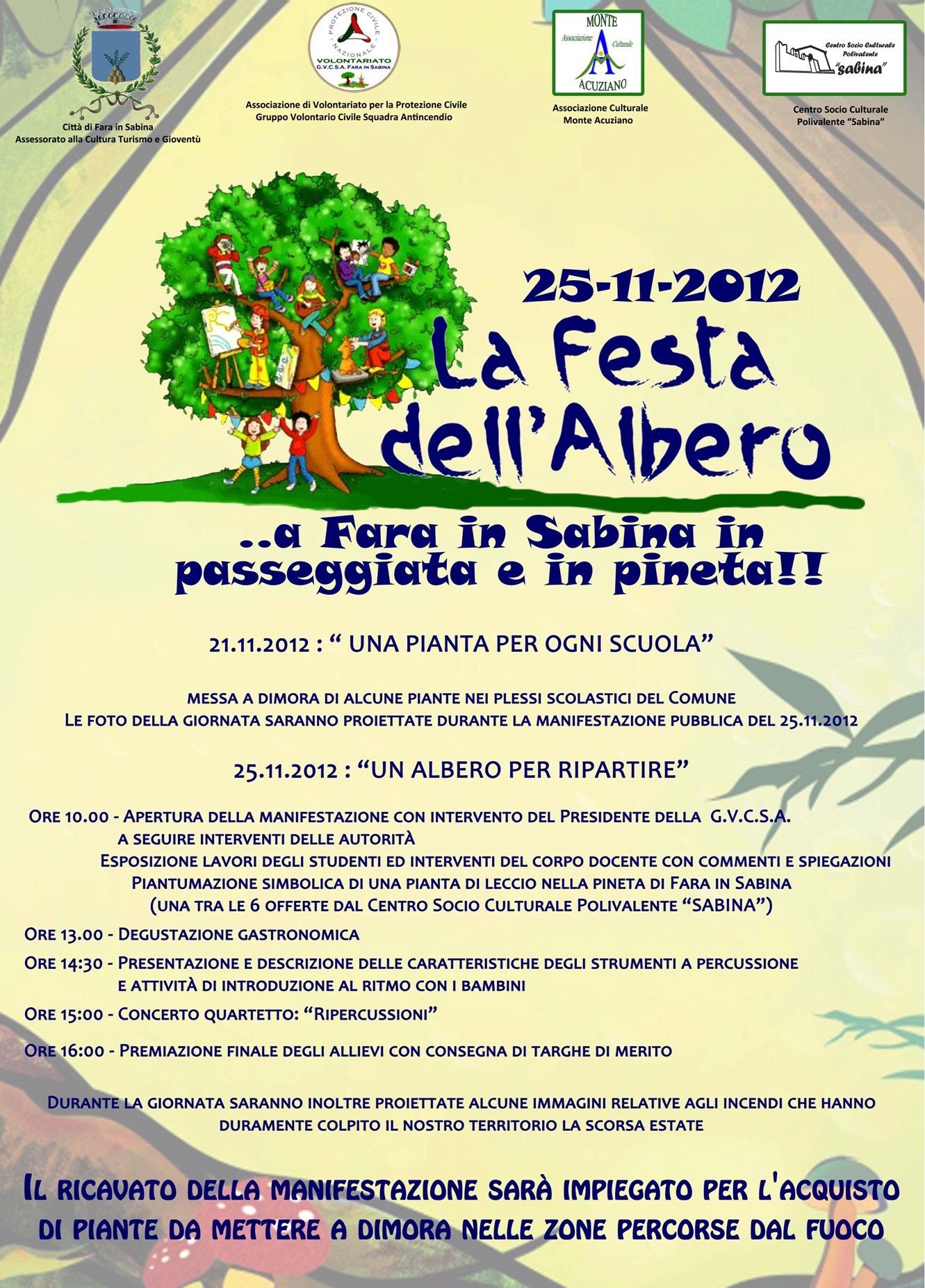 Il Gruppo di Volontariato di Protezione Civile Squadra Antincendio di Fara in Sabina in collaborazione con il Comune di Fara in Sabina promuove e invita tutti a partecipare alla Festa dell’Albero 2012 che si svolgerà nella pineta di Fara in Sabina domenica 25 novembre 2012 per ..