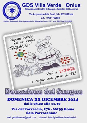 Questo Natale fai un regalo originale: vieni a donare e regala una parte di te!. È questo l’invito rivolto dall’associazione GDS Villa Verde Onlus‚ che organizza per domenica 21 dicembre 2014 una Donazione del Sangue dalle 8 alle 11:30 nella Sala Parrocchiale in Via del Torraccio 270 a Roma.