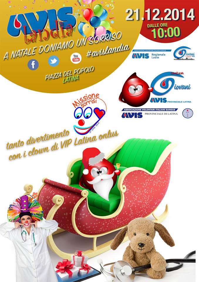 Domenica 21 dicembre 2014 la Consulta Giovani di Avis Provinciale Latina invita in Piazza del Popolo dalle ore 10.00 alle 19.00 per l’evento AvisLandia Latina: gli operatori saranno presenti con il loro stand per promuovere la donazione del sangue e‚ inoltre‚ ci saranno sorprese e gadget per tutti.