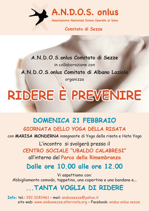 A.N.D.O.S. onlus Comitato di Sezze in collaborazione con A.N.D.O.S. onlus Comitato di Albano Laziale organizza Ridere è prevenire una giornata dello Yoga della risata. Domenica 21 febbraio dalle 10.00 alle 12.00 presso il Centro Sociale “Ubaldo Calabresi” all‛interno del Parco della Rimembranza a Sezze (LT) si svolgerà l’incontro condotto da Marisa Monderna insegnante di Yoga della risata e Hata Yoga. Le associazioni vi aspettano con abbigliamento comodo‚ tappetino‚ una copertina e una bandana e... tanta voglia di ridere! Per informazioni chiama il cell. 392.3283461 oppure scrivi andossezze@yahoo.it sito web: www.andossezze.altervista.org oppure seguici su Facebook