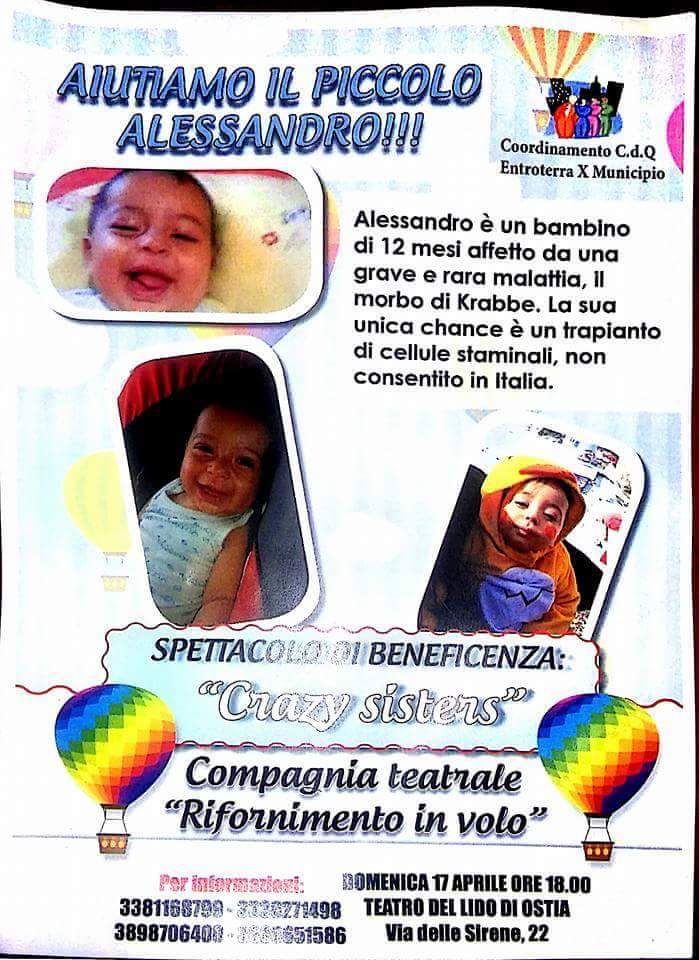 La compagnia teatrale Rifornimento in volo sarà i scena domenica 17 Aprile 2016 alle ore 18.00 con lo spettacolo di beneficenza Crazy Sister. Il ricavato dello spettacolo sarà devoluto per aiutare il piccolo Alessandro‚ un bambino di 12 mesi affetto da una grave e rara malattia‚ il morbo di Krabbe.