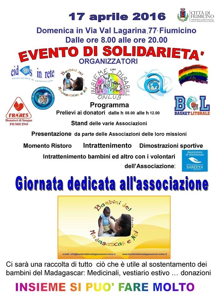 Le associazioni Eidos in Rete‚ Fratres Fiumicino‚ Il cuore di Cristiano‚ Bambini del Madagascar e noi‚ Insieme con i disabili‚ L’arcobaleno di Ale‚ Basket Litorale‚ con la collaborazione dell’associazione Progetto Sarepta e con il patrocinio della città di Fiumicino ‚invitano ad un grande evento di solidarietà dal nome Insieme si può fare molto. L’appuntamento è per il giorno domenica 17 aprile dalle ore 8.00 alle ore 20.00 a Fiumicino (Isola Sacra) in via Val Lagarina 77. In programma una raccolta sangue dalle ore 8 alle 11.30 per il gruppo Fratres di Fiumicino‚ a seguire momento ristoro‚ buffet di dolci‚ stand di associazioni‚ animazione per bambini‚ dimostrazioni sportive‚ intrattenimenti‚ canti gospel‚ momento spirituale e presentazione delle mission delle associazioni che hanno aderito. La giornata ha lo scopo di raccogliere tutto ciò che può essere utile ai bambini del Madagascar: medicinali‚ vestiario estivo… donazioni.