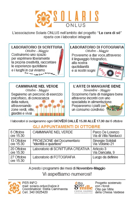 L’associazione Solaris‚ nell’ambito del progetto La cura di sé‚ anche quest'anno organizza una serie di Laboratori integrati: fotografia‚ scrittura‚ camminare nel verde e mangiare bene. Il primo incontro 'camminare nel verde' è fissato per giovedì 6 ottobre alle ore 15.30 presso il parco Fabio de Lorenzo in Via di Villa Narducci a Roma (di fronte CSM di Via Boemondo). Per maggiori informazioni contattare il numero: 340.0625420 o scrivere a: solaris.onlus@alice.it