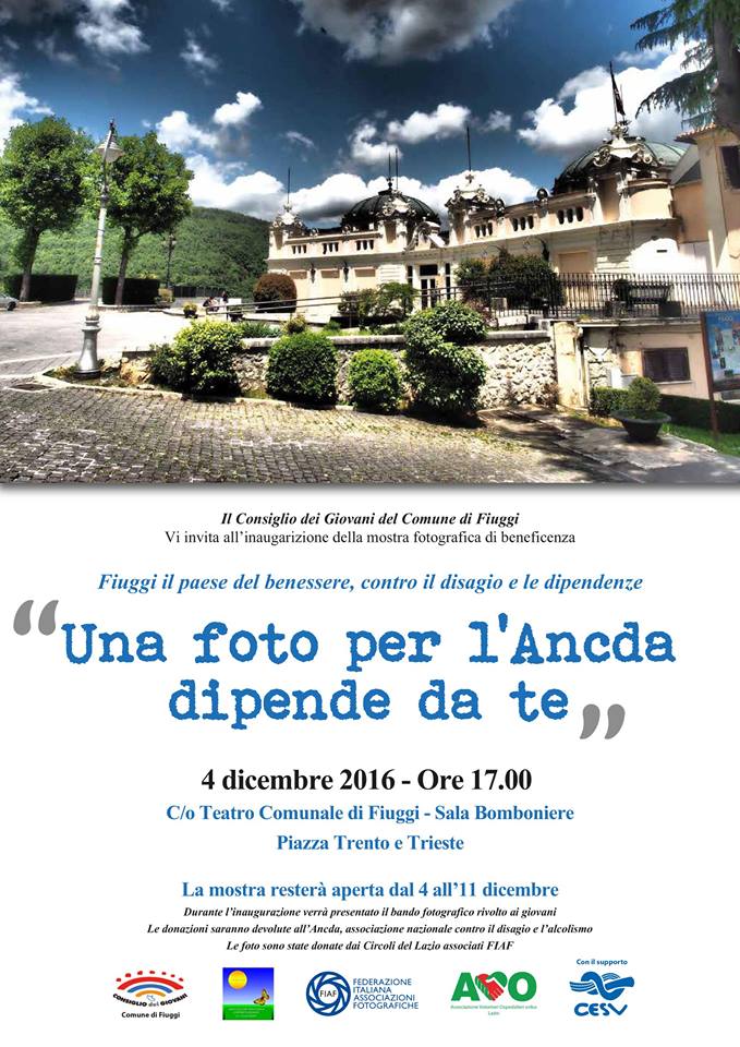 Il Consiglio dei Giovani del Comune di Fiuggi‚ in collaborazione con la FIAF - Federazione Italiana Associazioni Fotografiche‚ l’AVO Lazio - Associazione Volontari Ospedalieri e con il supporto del CESV - Centro Servizi per il Volontariato del Lazio hanno organizzato una mostra fotografica di beneficenza dal titolo "Fiuggi‚ il paese del benessere‚ contro il disagio e le dipendenze - Una foto per l'ANCDA dipende da te".