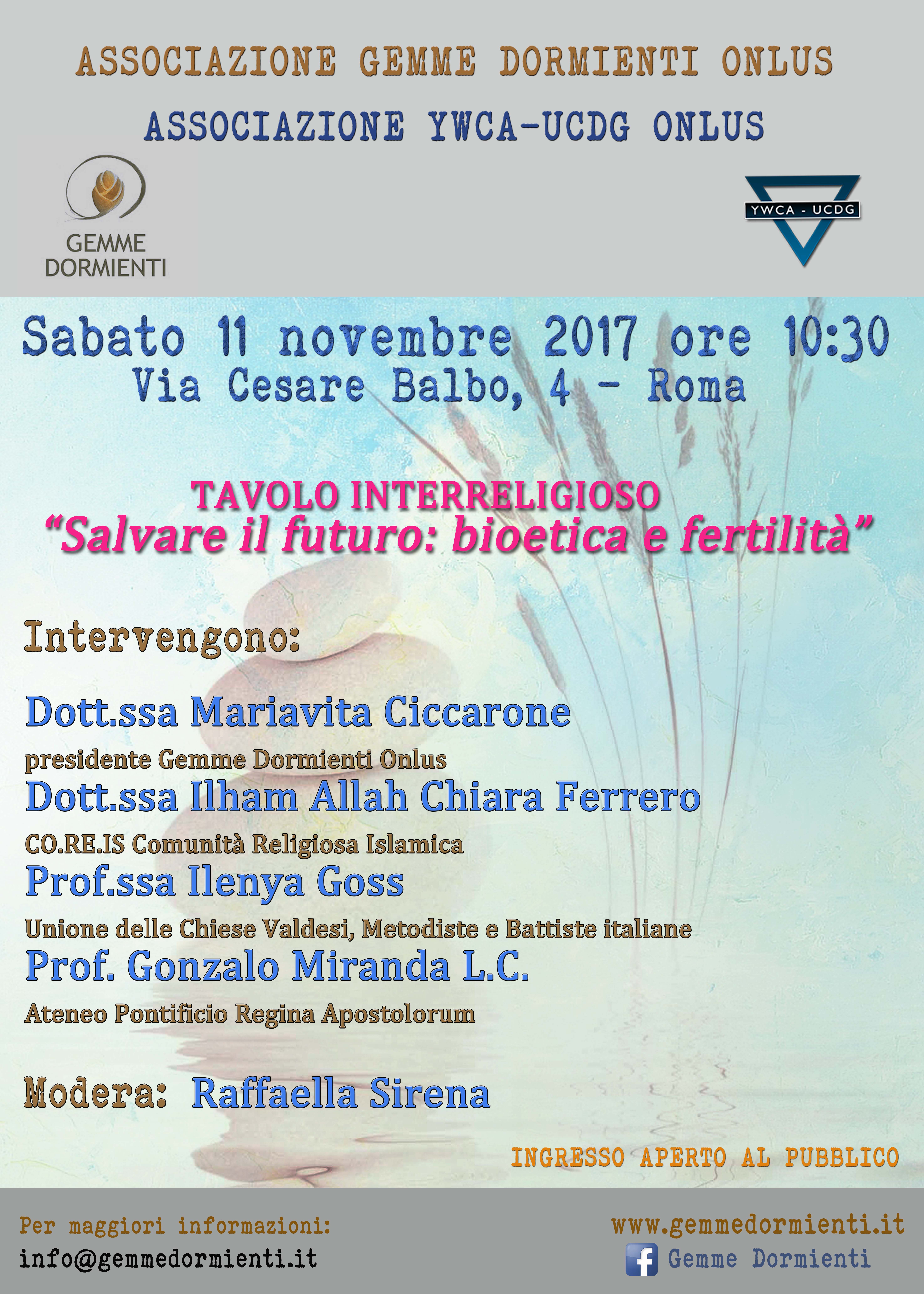 Sabato 11 novembre alle ore 10.30‚ presso la sede di YWCA-UCDG Onlus in via Cesare Balbo‚ 4‚ si terrà un tavolo interreligioso sul tema della fertilità e delle implicazioni in campo medico‚ sociale ed etico dei percorsi personali a tutela della capacità riproduttiva. L’incontro di approfondimento scientifico e bioetico‚ intitolato “Salvare il futuro: bioetica e fertilità”‚ è organizzato dall’associazione Gemme Dormienti Onlus in collaborazione con YWCA‚ Ateneo Pontificio Regina Apostolorum e COREIS – Comunità Religiosa Islamica Italiana. Durante l’incontro‚ che sarà moderato dalla giornalista Raffaella Sirena di Gemme Dormienti Onlus‚ interverranno i relatori: Dott.ssa Mariavita Ciccarone (ginecologa e presidente dell’Associazione Gemme Dormienti)‚ Prof. Gonzalo Miranda L.C. (docente ordinario di Bioetica presso l’Ateneo Pontificio Regina Apostolorum)‚ Prof.ssa Ilenya Goss (pastora valdese presso la Chiesa Metodista di Vicenza e membro della Commissione bioetica dell’Unione delle Chiese Valdesi e Metodiste e delle Chiese Battiste italiane) e Dott.ssa Ilham Allah Chiara Ferrero (segretario generale di CO.RE.IS Comunità Religiosa Islamica). Maggiori informazioni sono disponibili sul sito www.gemmedormienti.it e sulla pagina Facebook Gemme Dormienti.