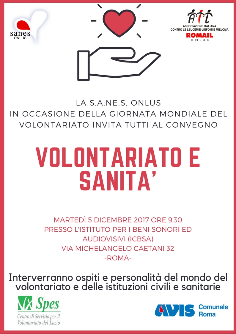 In occasione della giornata mondiale del volontariato‚ il 5 dicembre dalle ore 9.30‚ l'associazione Sanes onlus organizza un convegno sul tema Volontariato e sanità. Parteciperanno al convegno ospiti e personalità del mondo del volontariato e delle istituzioni civili e sanitarie tra cui: SPES - Centro di Servizio per il Volontariato del Lazio. AVIS‚ ROMAIL‚ l'ASL Roma 3 e Paolo Masini. Il convegno si terrà presso l'istituto per i beni sonori ed audiovisivi (ICSBA) in via Michelangelo Caetani a Roma.