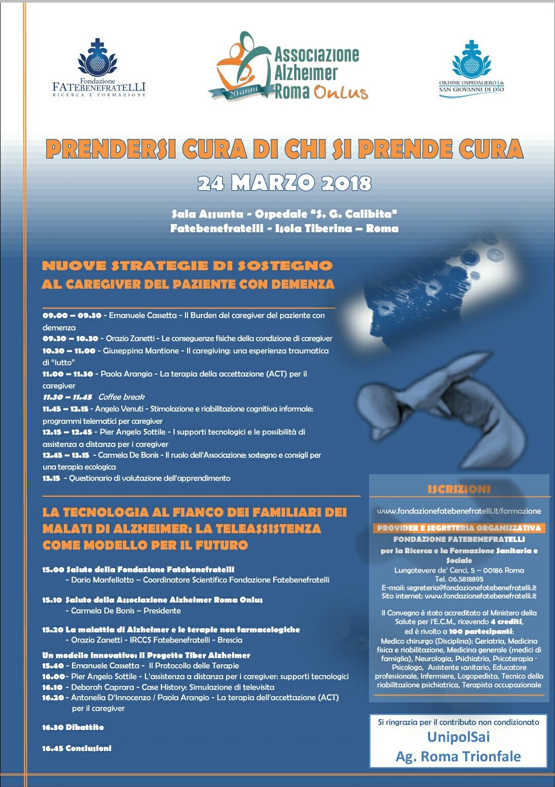 La Fondazione Fatebenefratelli‚ insieme all’Associazione Alzheimer Roma Onlus e l’Ordine Ospedaliero San Giovanni Di Dio promuovono il convegno Prendersi cura di chi si prende cura dedicato al le nuove strategie di sostegno al caregiver del paziente con demenza e sulla tecnologia al fianco dei familiari dei malati di alzheimer e la teleassistenza come modello per il futuro. Il convegno si terrà sabato 24 marzo 2018 in Sala Assunta nell’ospedale “S. G. Calibita” al Fatebenefratelli‚ Isola Tiberina a Roma. Per informazioni scrivi a: segreteria@fondazionefatebenefratelli.it oppure visita il sito