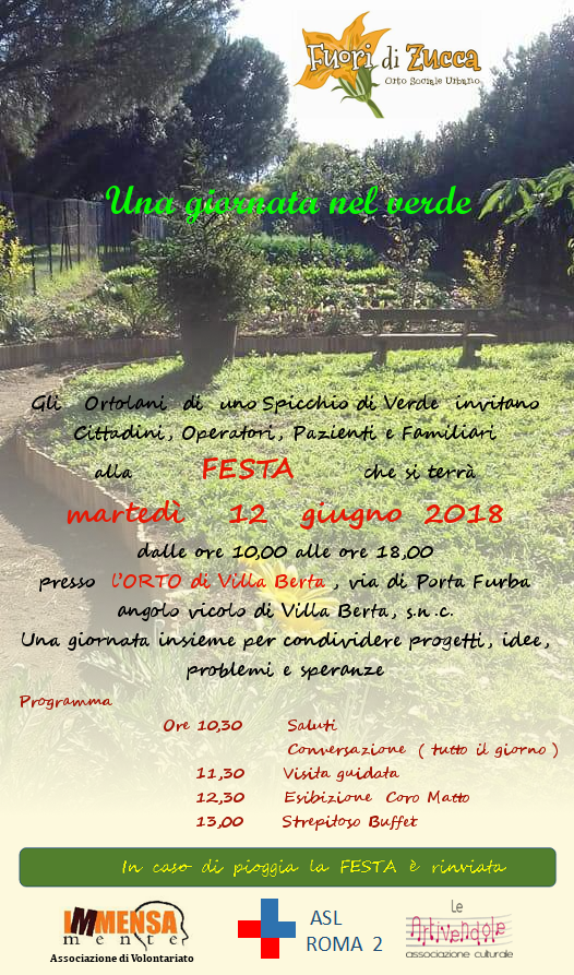 Si svolgerà martedì 12 giugno 2018 presso il Parco di Villa Berta‚ in via di Porta Furba (angolo vicolo di Villa Berta) dalle ore 10‚00 alle ore 18‚00‚ l’iniziativa “Una giornata nel verde”. Una festa nel bel mezzo della natura‚ organizzata dagli ortolani di “Uno Spicchio di Verde “‚ l’orto didattico multifunzionale gestito dall’associazione di volontariato “Immensa…MENTE “ Onlus‚ che si occupa di salute mentale‚ in collaborazione con gli operatori del Centro Salute Mentale della ASL Roma 2 Distretto 5. Una giornata di festa cui sono invitati cittadini‚ operatori‚ pazienti e familiari‚ per stare insieme tra idee e speranze‚ oltre che per condividere con tutti la gioia del loro lavoro‚ i risultati ottenuti‚ le difficoltà incontrate ed i progetti che intendono realizzare. Programma: