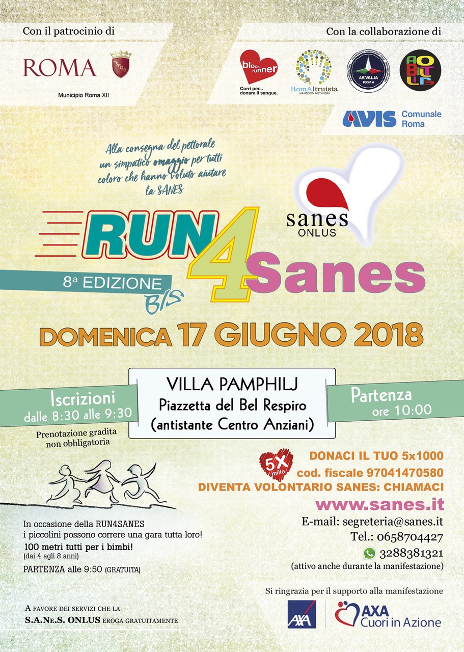 Domenica 17 giugno 2018‚ presso Villa Pamphilj - Piazzetta del Bel Respiro (adiacente Centro Anziani)‚ si terrà l’ottava edizione bis di Run 4 Sanes‚ gara di 5km non competitiva promossa dall’Associazione Sanes. La corsa serve per sostenere i servizi che quest’ultima offre gratuitamente ai pazienti ematologici del XII Municipio‚ ed ha il patrocinio di Roma Capitale e la collaborazione di Avis Comunale Roma‚ Blood Runner‚ Protezione Civile Arvalia‚ Abili Oltre‚ Roma Altruista ed il supporto di AXA Cuori in Azione. L’ingresso è in Via Vitellia o Via Leone XIII e l’appuntamento è dalle ore 8.30. Alle 9.50 è prevista una mini gara di 100 metri per bambini dai 4 agli 8 anni‚ gratuita. Alle 10 la partenza della 5 km non competitiva: viene richiesta una piccola offerta al fine di sostenere i servizi dell’associazione. Ai partecipanti verrà dato un piccolo ristoro ed un omaggio a fine corsa. Chiunque può partecipare‚ compresi gli amici a 4 zampe (è preferibile che stiano al guinzaglio). Per le società sportive che consegnano la lista su carta intestata della società con nomi‚ cognomi e tesseramento‚ ogni 15 atleti uno è gratuito! Inoltre per chi volesse acquistare la maglia della Sanes l’iscrizione sarà di 12 € anziché 15 €! È gradita la prenotazione tramite mail segreteria@sanes.it‚ whatsapp 328.8381321 e telefonicamente dal lunedì al venerdì dalle 8.00 alle 14.00 al numero 06.58704427.