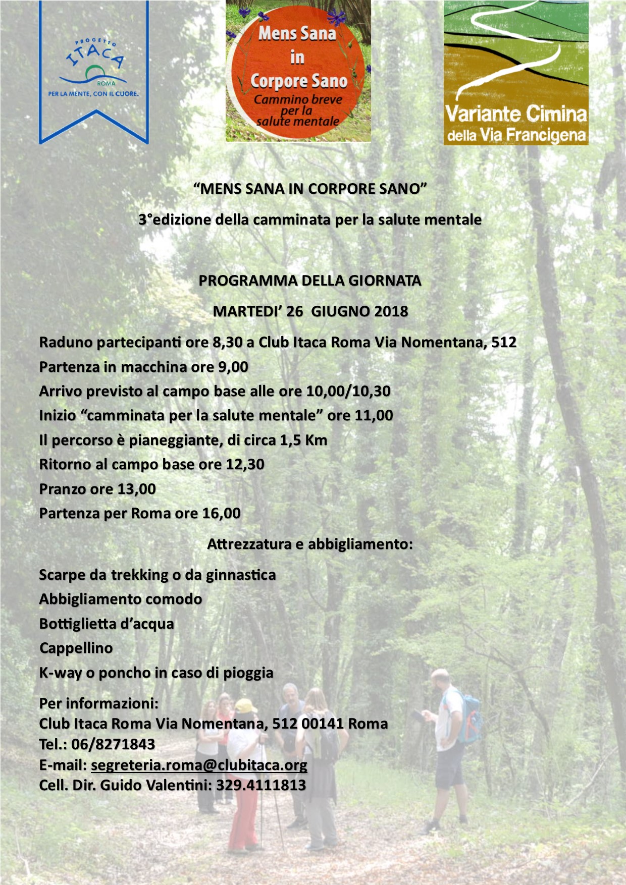 Martedì 26 giugno terzo appuntamento con “Mens sana in corpore sano” in collaborazione con l’Associazione Variante Cimina della Via Francigena. L’appuntamento è dalle ore 8:30 a Club Itaca Roma Via Nomentana‚ 512 o eventualmente alle ore 10:30 presso il Lago di Vico in località Canale. L’inizio della camminata della salute sarà alle ore 11:00 con un percorso di circa 1‚5 km al quale seguirà un gustoso pranzo all’aperto (verso le ore 13:00). Si consiglia un abbigliamento comodo‚ scarpe da trekking o da ginnastica‚ inoltre è opportuno portare con sé una bottiglietta d’acqua‚ un cappellino e un k-way o poncho in caso piovesse. Per l’iscrizione è richiesta una donazione di 10 €‚ con conferma preferibilmente entro lunedì 25 giugno. Per ulteriori info: tel: 06.8271843 e- mail: segreteria.roma@clubitaca.org cell. 329.4111813