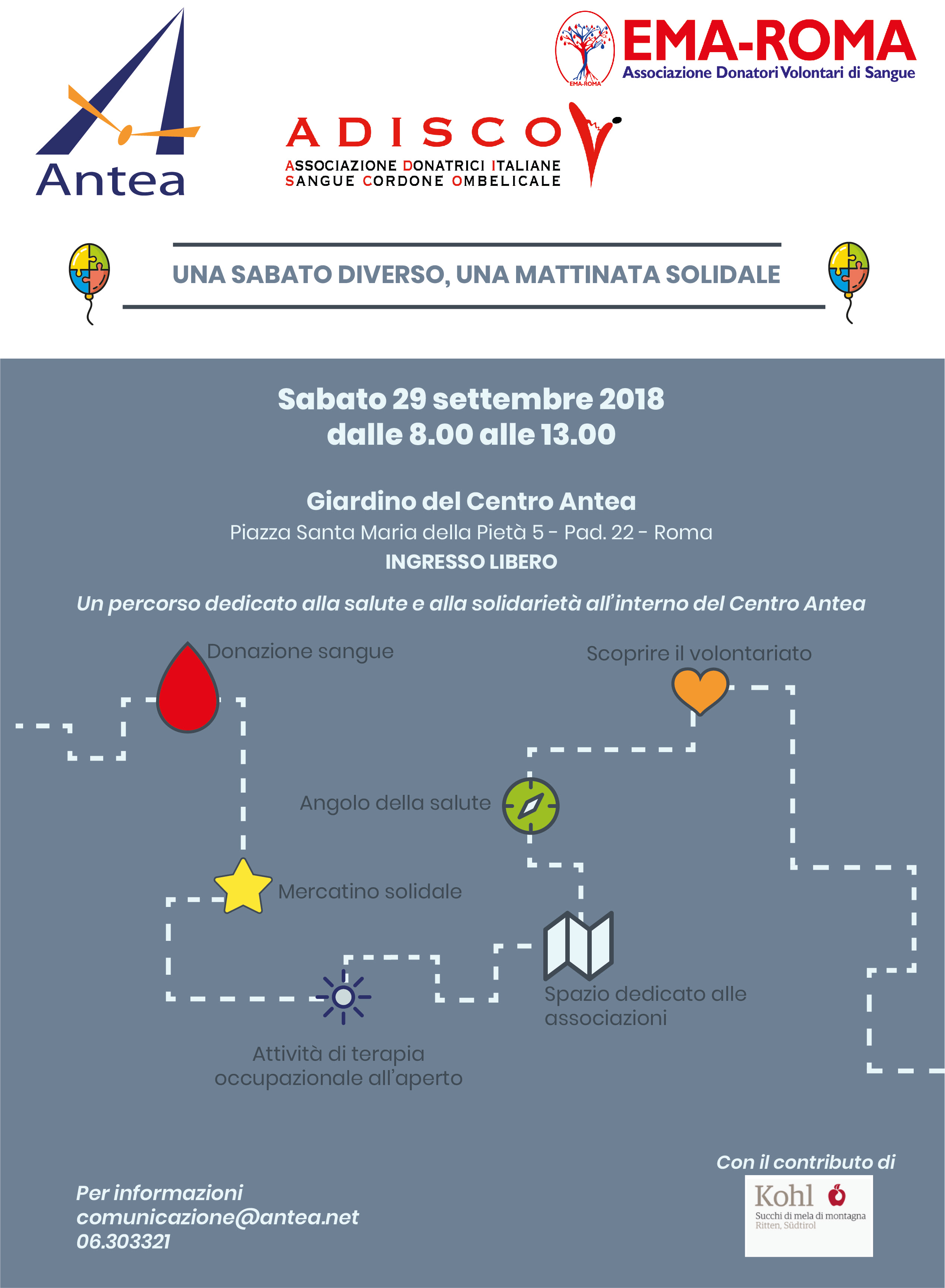 Sabato 29 settembre 2018 dalle ore 8:00 alle ore 13:00 presso il Giardino del Centro Antea‚ si terrà l'incontro promosso da Antea‚ Adisco ed Ema Roma che seguirà un percorso dedicato alla salute e alla solidarietà. L’ingresso libero è da Piazza Santa Maria della Pietà‚ 5 – Pad. 22 Tra i temi trattati: donazione sangue; mercatino solidale; attività di terapia occupazionale all’aperto; spazio dedicato alle associazioni; scoprire il volontariato ecc. Per informazioni: comunicazione@antea.net oppure chiama il 06.303321