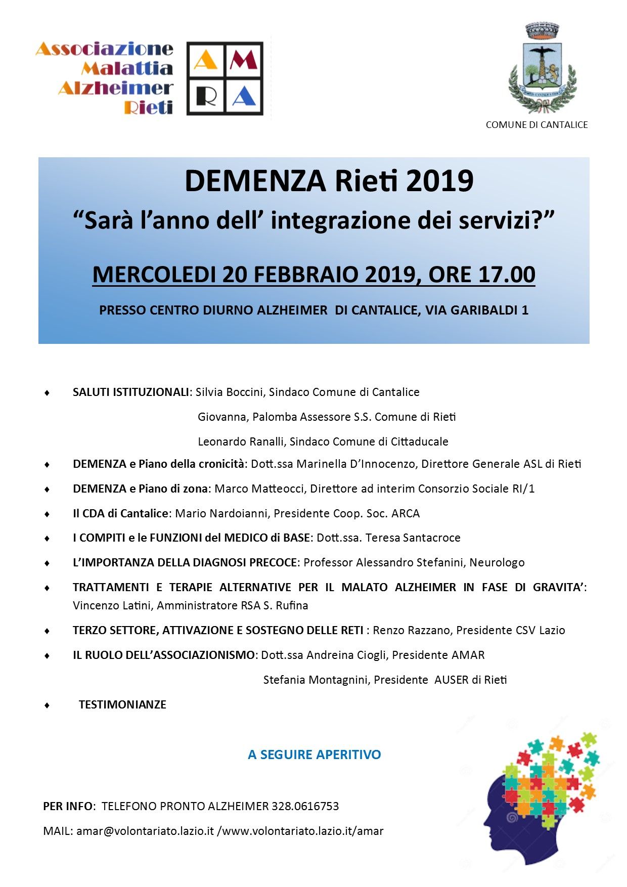 L'associazione AMAR - Associazione Malattia Alzheimer Rieti organizza per mercoledì 20 febbraio dalle ore 17‚00 l'incontro Demenza Rieti 2019: sarà l'anno dell'integrazione dei servizi? I temi trattati saranno: demenza e piano della cronicità‚ demenza e piano di zona‚ i compiti e le funzioni del medico di base‚ l'importanza della diagnosi precoce‚ trattamenti e terapie alternative per il malato di alzheimer in fase di gravità‚ il terzo settore‚ attivazione e sostegno delle reti‚ il ruolo dell'associazionismo. Al termine dell'incontro l'associazione offrirà un aperitivo. Per informazioni è possibile chiamare il Telefono Pronto Alzheimer cell. 328.0616753 o scrivere a amar@volontariato.lazio.it