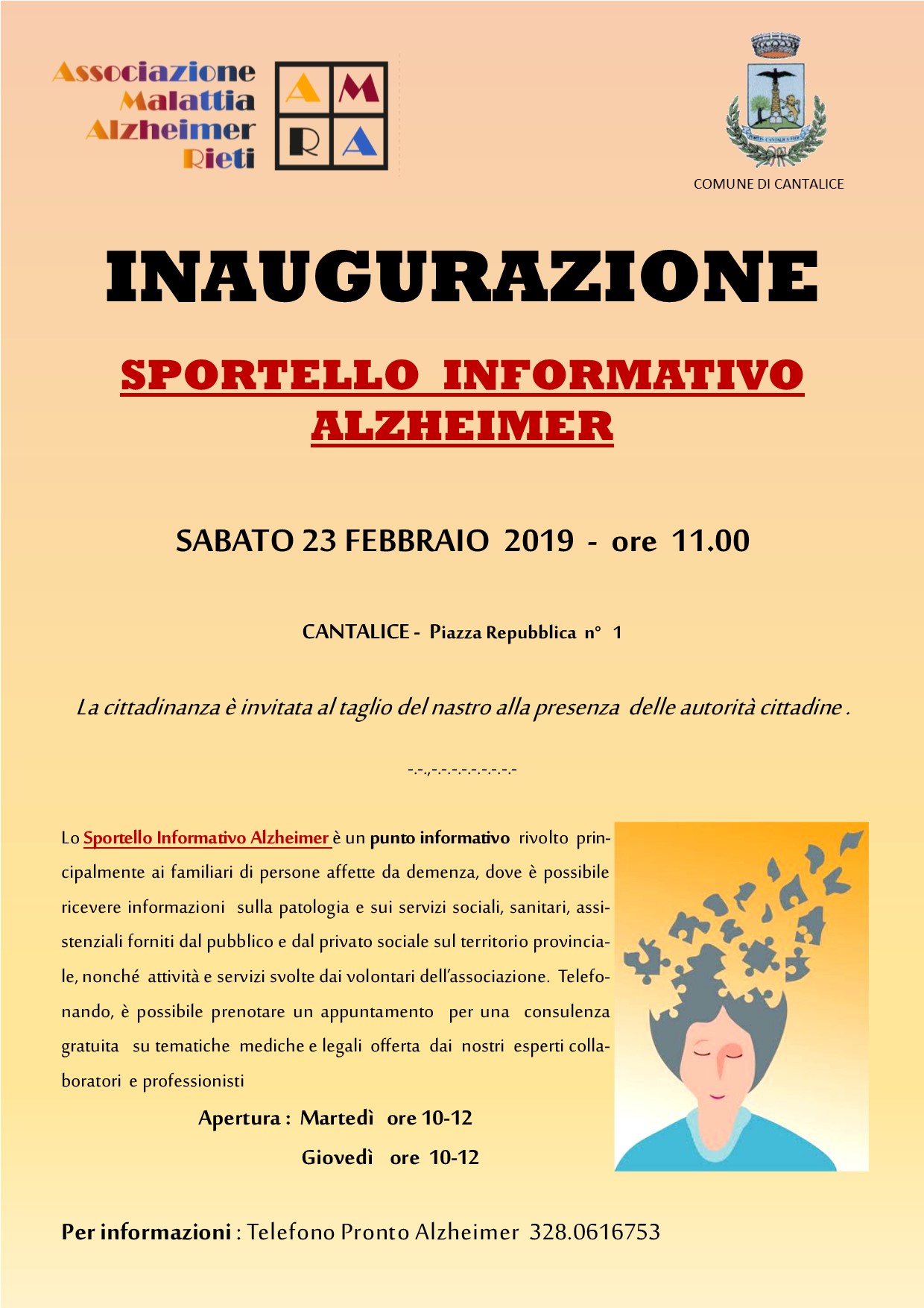 Sabato 23 febbraio 2019 alle ore 11.00 si terrà l'inaugurazione del nuovo Sportello Informativo Alzheimer a Cantalice (RI) in Piazza Repubblica‚ 1‚ nato dalla collaborazione tra l'associazione AMAR - Associazione Malattia Alzheimer Rieti e il Comune di Cantalice. Lo Sportello Informativo Alzheimer è un punto informativo rivolto principalmente ai familiari di persone affette da demenza‚ dove è possibile ricevere informazioni sulla patologia e sui servizi sociali‚ sanitari‚ assistenziali forniti dal pubblico e dal privato sociale sul territorio provinciale‚ nonché attività e servizi svolti dai volontari dell'associazione. Telefonando‚ è possibile prenotare un appuntamento per una consulenza gratuita su tematiche mediche e legali offerta da esperti collaboratori e professionisti. Lo sportello sarà aperto martedì dalle 10.00 alle 12.00 e giovedì dalle 10.00 alle 12.00. Per informazioni è possibile contattare il Telefono Pronto Alzheimer cell.328.0616753