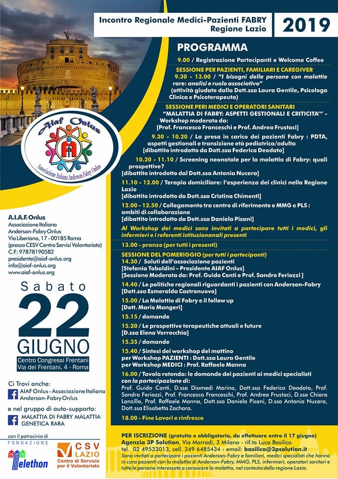 Un’intera giornata dedicata a pazienti‚ familiari‚ medici e operatori della salute del Lazio‚ riuniti tutti insieme per confrontarsi e approfondire gli aspetti clinici e gestionali della malattia di Anderson-Fabry. E’ l’incontro regionale medici-pazienti del Lazio organizzato da Aiaf Onlus per sabato 22 giugno a Roma al Centro Congressi Frentani in Via dei Frentani‚ 4 a Roma dalle 9.30 alle 18‚ con il Patrocinio di Telethon e del CSV Lazio. Con il supporto del suo Comitato scientifico l'associazione AIAF onlus ha l'obiettivo di rappresentare un punto di incontro tra pazienti‚ medici specialisti dei vari Centri regionali‚ infermieri‚ ricercatori‚ istituzioni e tutti i portatori di interesse che si occupano in diversi ambiti di Malattia di Fabry. Si parlerà delle finalità e della mission di Aiaf Onlus‚ con i progetti per il 2019 e l’impegno in tema di Terapia domiciliare. Quindi due sessioni parallele: una dedicata ai pazienti‚ che si confronteranno sui bisogni dei pazienti rari e il ruolo associativo‚ con l’aiuto della Dottoressa Laura Gentile‚ Psicologa e Psicoterapeuta e una dedicata ai medici e operatori sanitari‚ che affronteranno le diverse declinazioni degli aspetti gestionali e delle criticità riguardanti la presa in carico dei pazienti Fabry in un dibattito moderato dai Prof. Francesco Franceschi e Andrea Frustaci. Molti gli argomenti su cui i partecipanti saranno invitati a confrontarsi: dal PDTA alla transizione dall’età pediatrica a quella adulta‚ dalle prospettive dello Screening neonatale allargato alla Fabry alla terapia domiciliare‚ concludendo con il collegamento tra il Centro di riferimento e MMG e PLS. Dopo il pranzo il via alla sessione plenaria nel pomeriggio‚ in cui si parlerà anche di politiche regionali per i pazienti con Malattia di Fabry‚ grazie alla partecipazione della Dott.ssa Esmeralda Castronuovo‚ portavoce della Direzione Regionale Salute ed Integrazione Socio Sanitaria della Regione Lazio. Tra i temi che verranno trattati‚ un approfondimento scientifico sulla patologia e follow up (Dott. Mario Mangeri) e sulle prospettive terapeutiche attuali e future (D.ssa Elena Verrecchia). Verrà dedicato un ampio spazio alle domande dei pazienti e familiari‚ con una tavola rotonda finale che vedrà la partecipazione di molti medici specialisti di riferimento delle varie discipline a livello regionale: Prof. Guido Conti‚ D.ssa Diomedi Marina‚ Dott.ssa Federica Deodato‚ Prof. Sandro Feriozzi‚ Prof. Francesco Franceschi‚ Prof. Andrea Frustaci‚ Dott.ssa Chiara Lanzillo‚ Prof. Raffaele Manna‚ Dott.ssa Daniela Pisani‚ D.ssa Antonia Nucera e D.ssa Elisabetta Zachara. La partecipazione è gratuita ma‚ per motivi organizzativi‚ è necessario iscriversi contattando la segreteria organizzativa dell’evento entro e non oltre il 17 Giugno 2019: 3P Solution (Sig. Luca Basilico) tel. 02.49533013 o scrivere a: basilico@3psolution.it