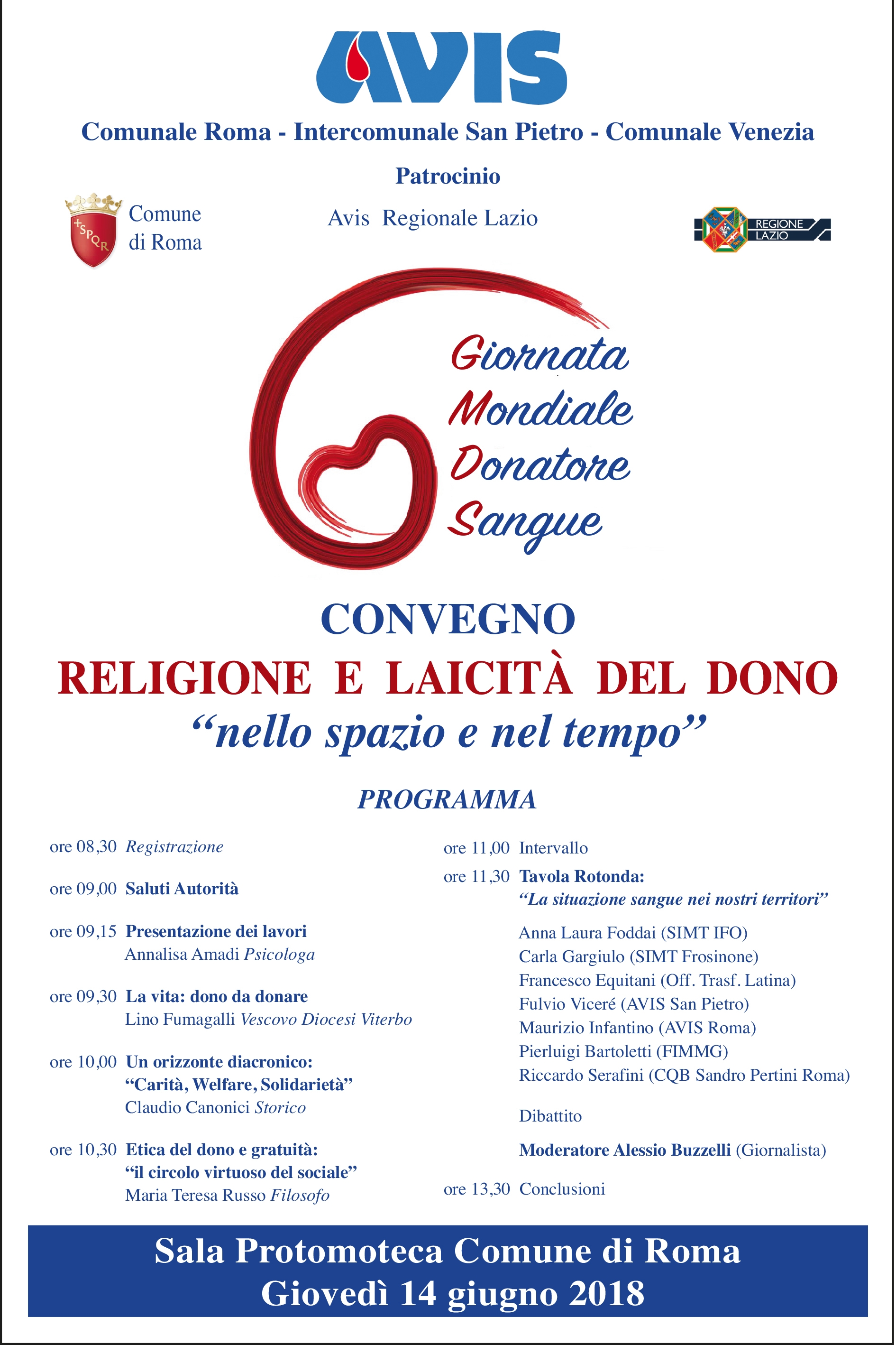 Il 14 Giugno sarà la Giornata mondiale del Donatore di Sangue 2018. Una ricorrenza che riaccende i riflettori su un tema – la donazione di sangue – che resta attuale‚ soprattutto nel Lazio‚ soprattutto in vista della stagione estiva. In questa occasione Avis Comunale Roma organizza per mercoledì 13 giugno alle ore 11.00 una conferenza stampa di presentazione della Giornata mondiale del Donatore di Sangue presso la sede dell'associazione‚ in Via Imperia 2. Alla conferenza stampa interverranno: Maurizio Infantino – Presidente Avis Comunale Roma; Fulvio Vicerè – Presidente Avis Regionale Lazio; Riccardo Mauri – Direttore Responsabile "Avis a Roma"; Alessio Buzzelli – Giornalista. Per giovedì 14 giugno alle ore 8.30 presso la sala Protomoteca del Comune di Roma‚ Avis Comunale di Roma‚ Intercomunale San Pietro e Comunale Venezia con il patrocinio del Comune di Roma‚ la Regione Lazio e Avis Regionale Lazio organizzano‚ poi‚ il convegno Religione e laicità del dono “nello spazio e nel tempo” con l’obiettivo di sensibilizzare la cittadinanza alla donazione del sangue‚ e far scoprire la vera essenza dell’uomo: la gratuità dell’offrirsi‚ del partecipare non solo emotivamente‚ ma anche dell’organizzare l’aiuto. All’iniziativa interverranno: la psicologa Annalisa Amadi; il Vescovo Lino Fumagalli‚ lo storico Claudio Canonici e la filosofa Maria Teresa Russo. La mattinata si chiuderà con una tavola rotonda per affrontare la situazione sangue nei nostri territori. Per informazioni Sara Lanzi‚ Avis Comunale Roma 06.4404249 - redazione@avisroma.it