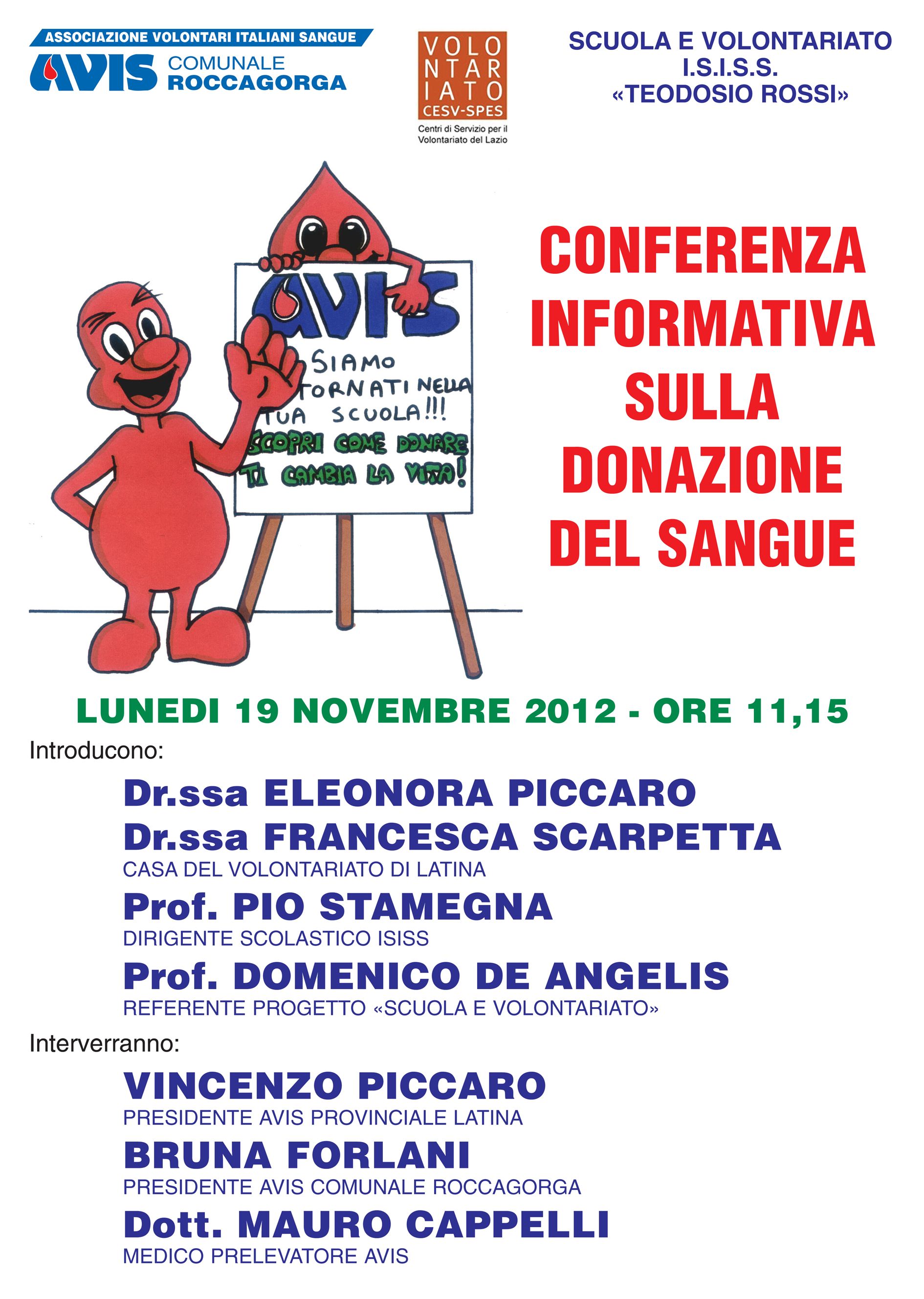 Si svolgerà nell’ambito del progetto Scuola e Volontariato‚ promossa dall’Avis comunale di Roccagorga‚ la Conferenza informativa sulla donazione del sangue.