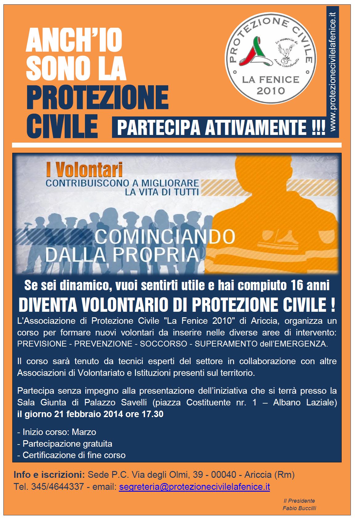 Partirà a marzo 2014 il corso gratuito per volontari di protezione civile organizzato dall’associazione La Fenice 2010 di Ariccia. Per chi fosse interessato‚ è possibile partecipare alla presentazione che ci sarà venerdì 21 febbraio alle ore 17‚30 ad Albano Laziale presso la Sala Giunta di Palazzo Savelli‚ in Piazza Costituente 1.