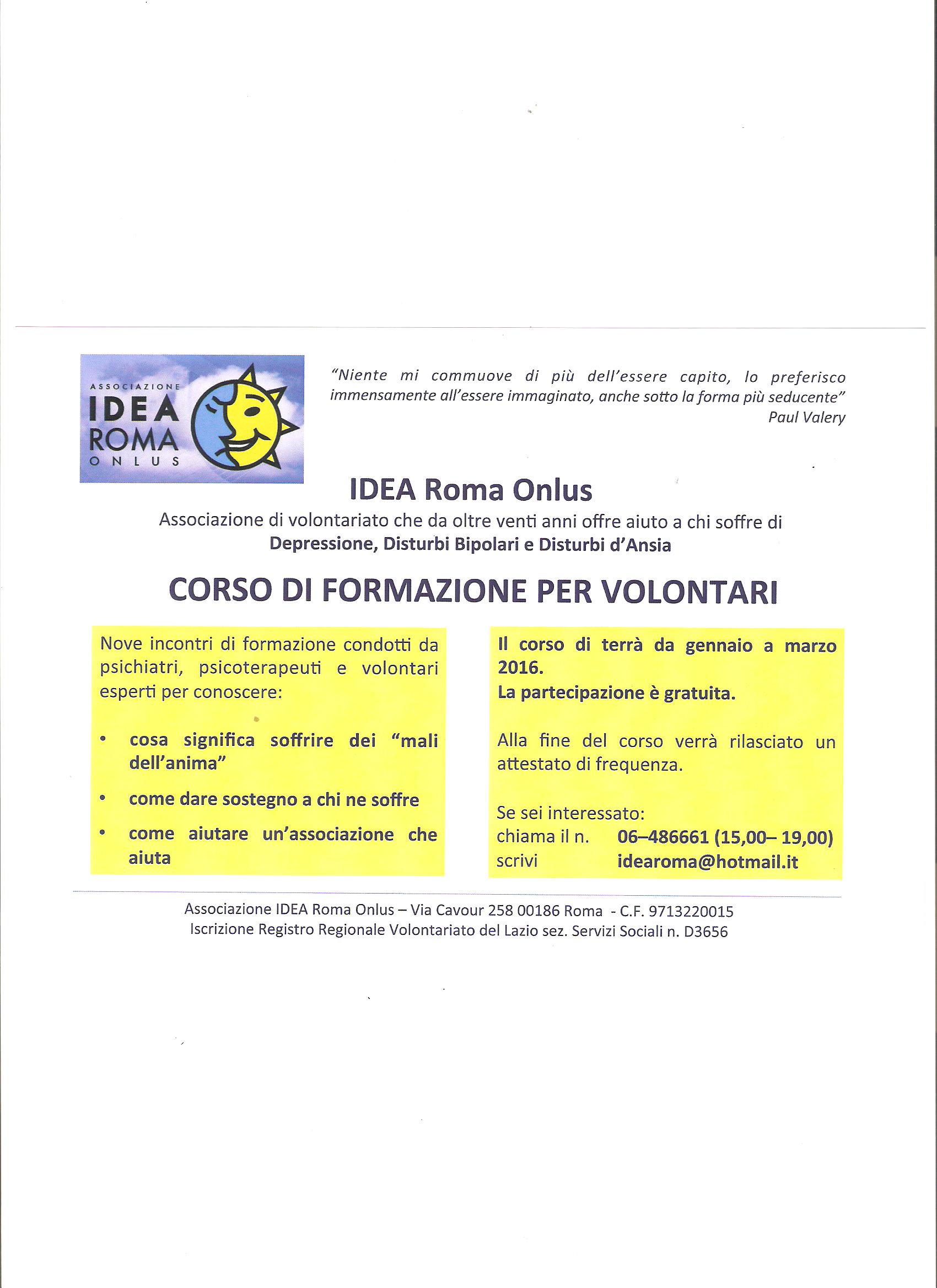Idea Roma onlus associazione di volontariato che da oltre vent’anni offre aiuto a chi soffre di depressione‚ disturbi bipolari e disturbi d’ansia organizza da gennaio a marzo 2016 un corso di formazione per volontari per preparare i potenziali volontari a svolgere le attività all’interno dell’associazione.