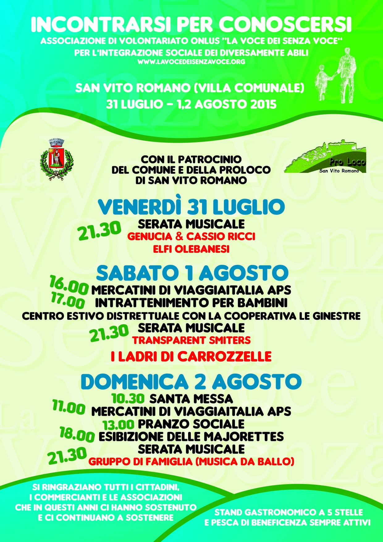 L’associazione di volontariato La voce dei senza voce‚ che si occupa di diversamente abili‚  ha organizzato Incontrarsi per conoscersi‚ un week end di giochi‚ gastronomia‚ spettacolo e intrattenimento‚ con anche una pesca di beneficienza.