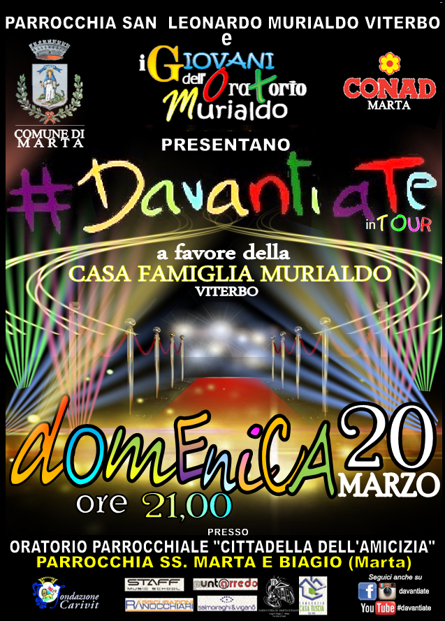 Domenica 20 Marzo alle ore 21.00 si accendono le luci dell’Oratorio “Cittadella dell’Amicizia” della Parrocchia SS. Marta e Biagio a Marta su “#DavantiaTe”. Lo spettacolo è stato pensato e arrangiato da professionisti del settore‚ per presentare a Marta la storia e la vita di San Leonardo Murialdo‚ santo della Torino dell’ ‘800‚ che si é speso per i giovani in difficoltà. Si respirerà il senso di gratuità‚ amicizia e solidarietà di chi ha messo a disposizione i propri talenti per il bene comune‚ potendo conoscere e sostenere le attività dell’Associazione Murialdo‚ in favore di bambini e ragazzi in gravi situazioni socio-familiari. Il progetto‚ che è partito lo scorso anno sostenuto dai giovani della Parrocchia San Leonardo Murialdo di Viterbo per attività di solidarietà‚ ha sostenuto per il primo anno le opere giuseppine della Sierra Leone devastate dal virus Ebola. Nel suo secondo anno itende invece sostenere le attività della Casa Famiglia per minori dell’Associazione Murialdo. #DavantiaTe è anche un CD che si potrà prendere allo spettacolo sempre con la stessa finalità. Per contattare l’Associazione Murialdo per maggiori informazioni: cell. 347.1508238 (Diana Dimonte) o visita il sito: www.associazionemurialdo.it