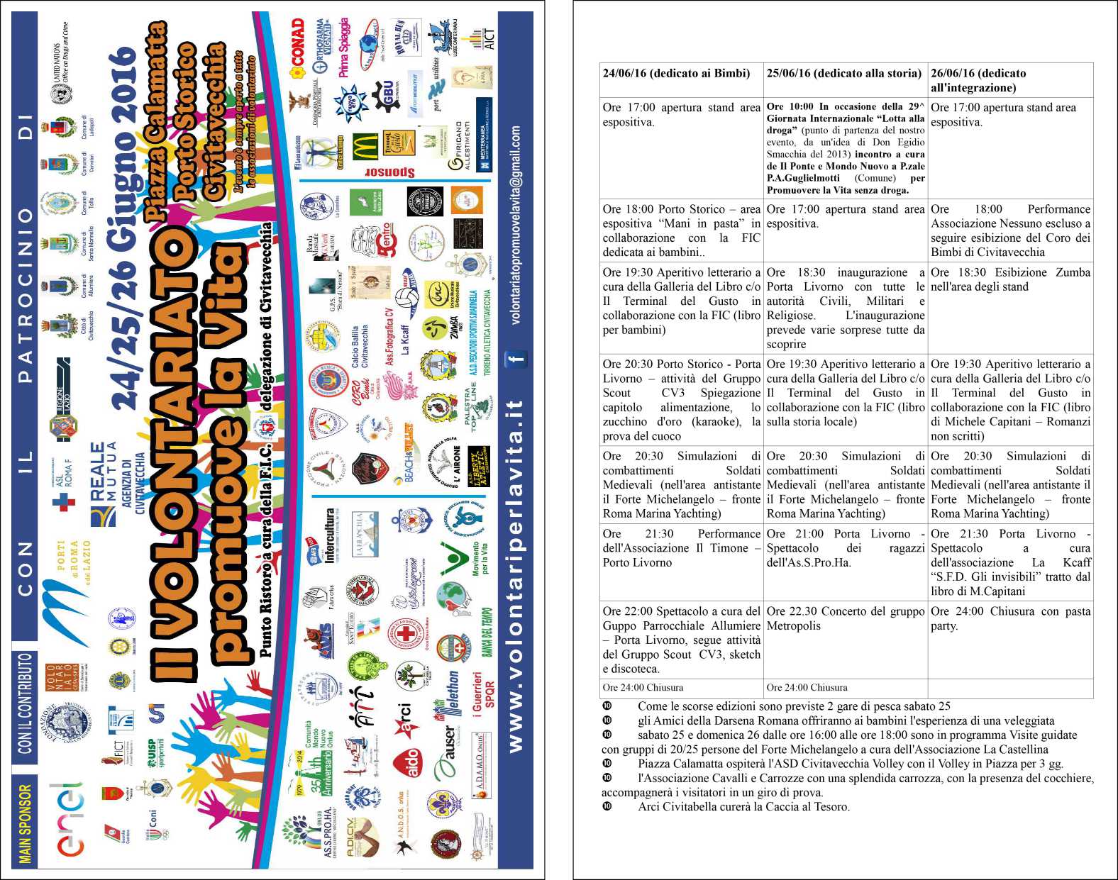 Torna anche quest’anno l’edizione de “Il volontariato promuove la vita”‚ con in programma tre giornate di attività quelle del 24‚ 25 e 26 giugno presso Piazza Calamatta al Porto Storico di Civitavecchia (RM). L’evento coinvolge molteplici realtà del volontariato‚ l’invito è aperto a tutti i cittadini‚ bambini e alle associazione di volontariato. Per maggiori informazioni scrivere a www.volontariperlavita.it o seguici Facebook