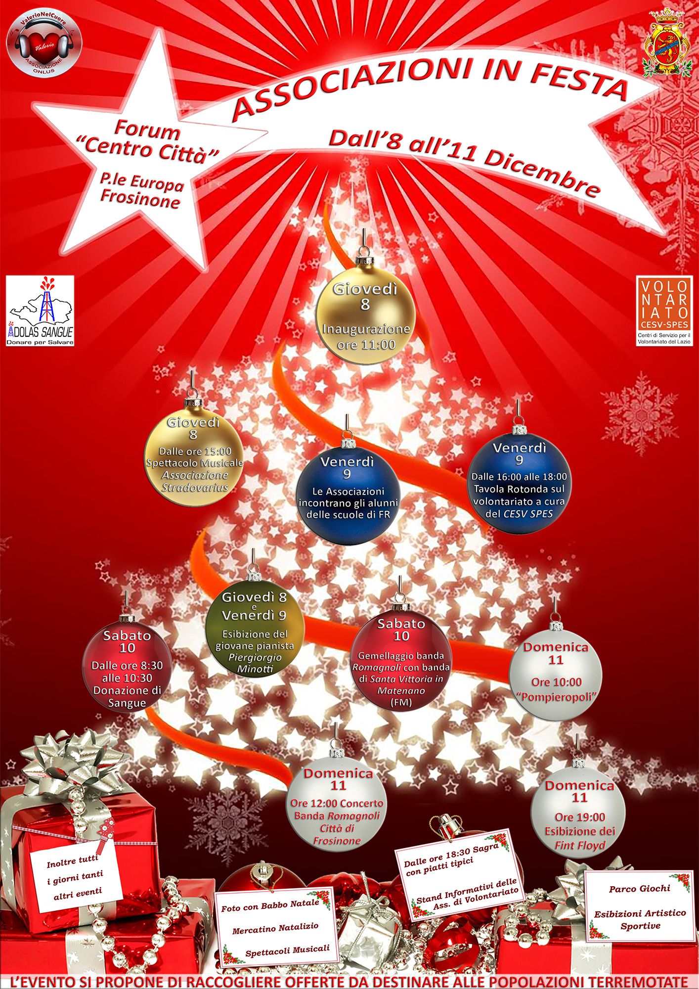 Le associazioni ValerioNelCuore e Adolas Sangue‚ con il patrocinio del comune di Frosinone‚ organizzano "Associazioni in festa" dall' 8 all'11 dicembre presso il centro commerciale “Centro Città” di piazzale Europa Frosinone‚ con lo scopo di conoscere e far conoscere le organizzazioni di volontariato della provincia. L'evento inoltre si propone di raccogliere fondi da destinare alle popolazioni terremotate del centro Italia. Durante i quattro giorni della manifestazione saranno organizzati eventi culturali‚ musicali‚ esibizioni sportive e di ballo‚ mostre di moto d'epoca‚ attività cinofile‚ intrattenimenti per bambini‚ sagre gastronomiche e sarà allestito un mercatino natalizio con prodotti tipici e artigianali. Venerdì 9 alle ore 16.00 si terrà il convegno Volontariato come partecipazione: un confronto con le istituzioni‚ una tavola rotonda a cui parteciperà: Gianrico Rossi‚ Presidente Acli Provinciali di Frosinone‚ Francesco Giorgi‚ Direttore UOC Urp Comunicazione‚ Accoglienza‚ Tutela e Partecipazione ASL Frosinone‚ Antonio Felice Fargnoli‚ Vice Presidente A.Ge. Nazionale‚ Giovanni Guglielmi‚ Dirigente Scolastico I.C.IV Frosinone e Sergio Crescenzi‚ Assessore alla polizia locale‚ sicurezza e Protezione Civile.Modera Paola Capoleva‚ Presidente CESV Centro Servizi per il Volontariato. Sabato 10 dalle ore 8:00 alle ore 10:30 sarà organizzata una raccolta sangue straordinaria a cura dell'associazione Adolas Sangue‚ a seguire gemellaggio della banda Romagnoli con la banda di Santa Vittoria in Matenano (paese colpito dal sisma del 30 ottobre).